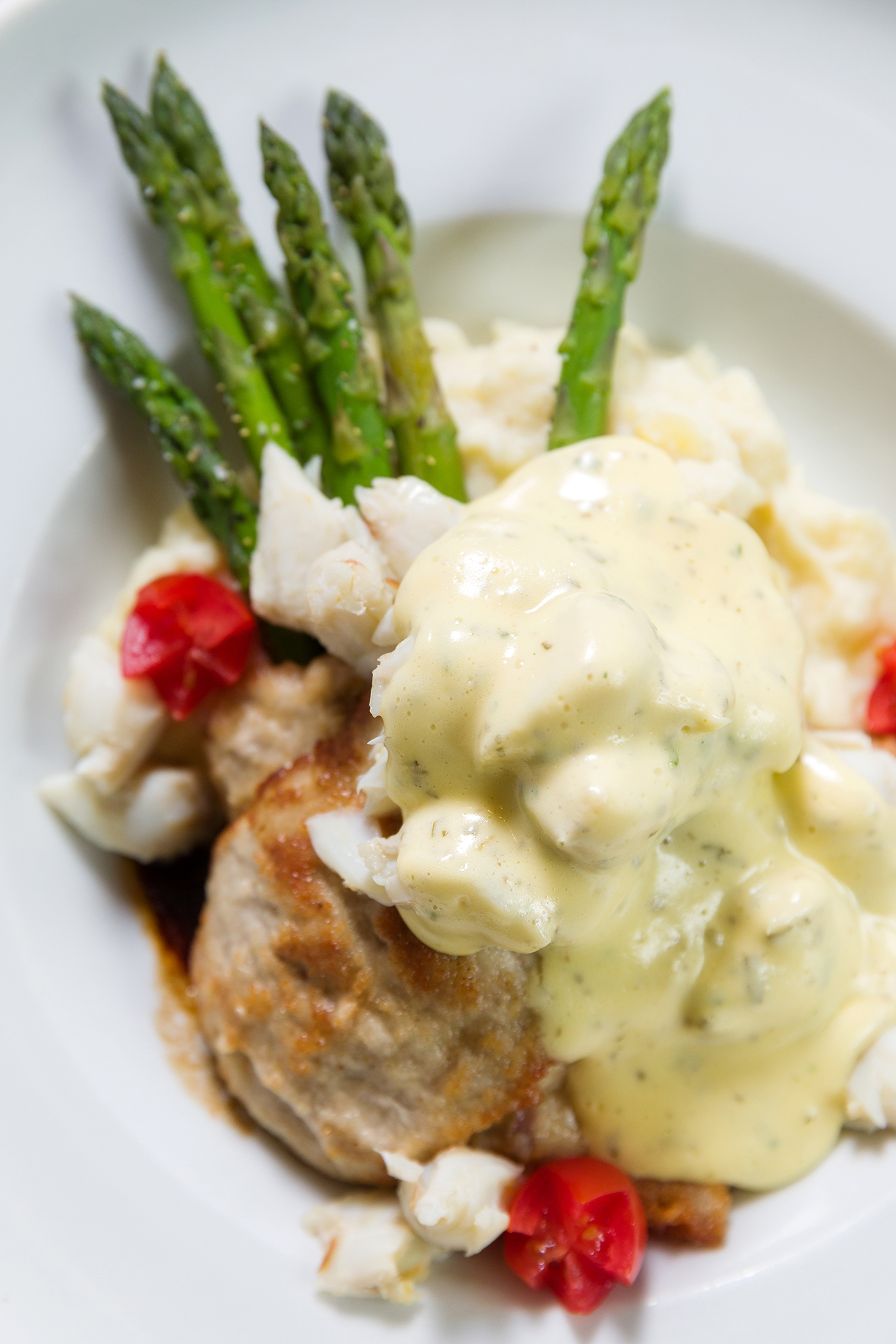 The Veal Oscar entree looked intriguingly mouthwatering. The veal cutlets were pounded thin and nicely breaded, then topped with a ridiculous pile of lump crab. I found the bearnaise a bit bland, but the luscious brown gravy more than compensated. I’m not sure if the side was mashed potatoes with a boatload of butter or a boatload of butter with a whisper of potato. For me, a tiny portion was plenty.