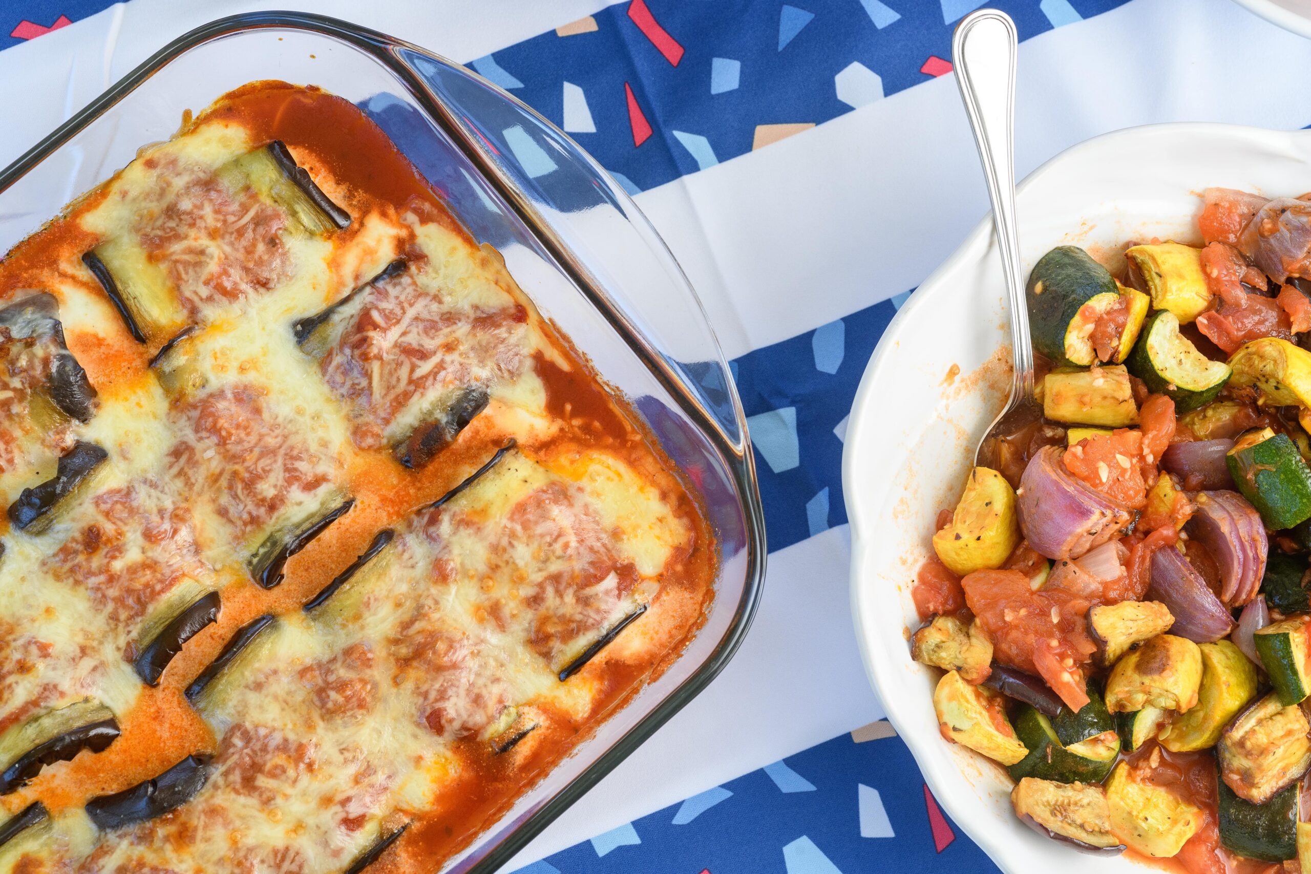 Eggplant Parmesan is one of my favorite comfort food dishes. But it can get a little heavy once the eggplant is breaded and fried. I also find that frying the eggplant can mask the delicate flavor of the eggplant itself. This recipe of ricotta-stuffed eggplant roulades is very reminiscent of an eggplant Parmesan, but it allows the eggplant to shine through without all that extra breading. To start, I lightly roast thin slices of eggplant and fill them with a mixture of ricotta and Parmesan. Then I roll them into little roulades. I place the eggplant roulades in casserole dishes with my favorite prepared marinara sauce and top with grated mozzarella before baking.