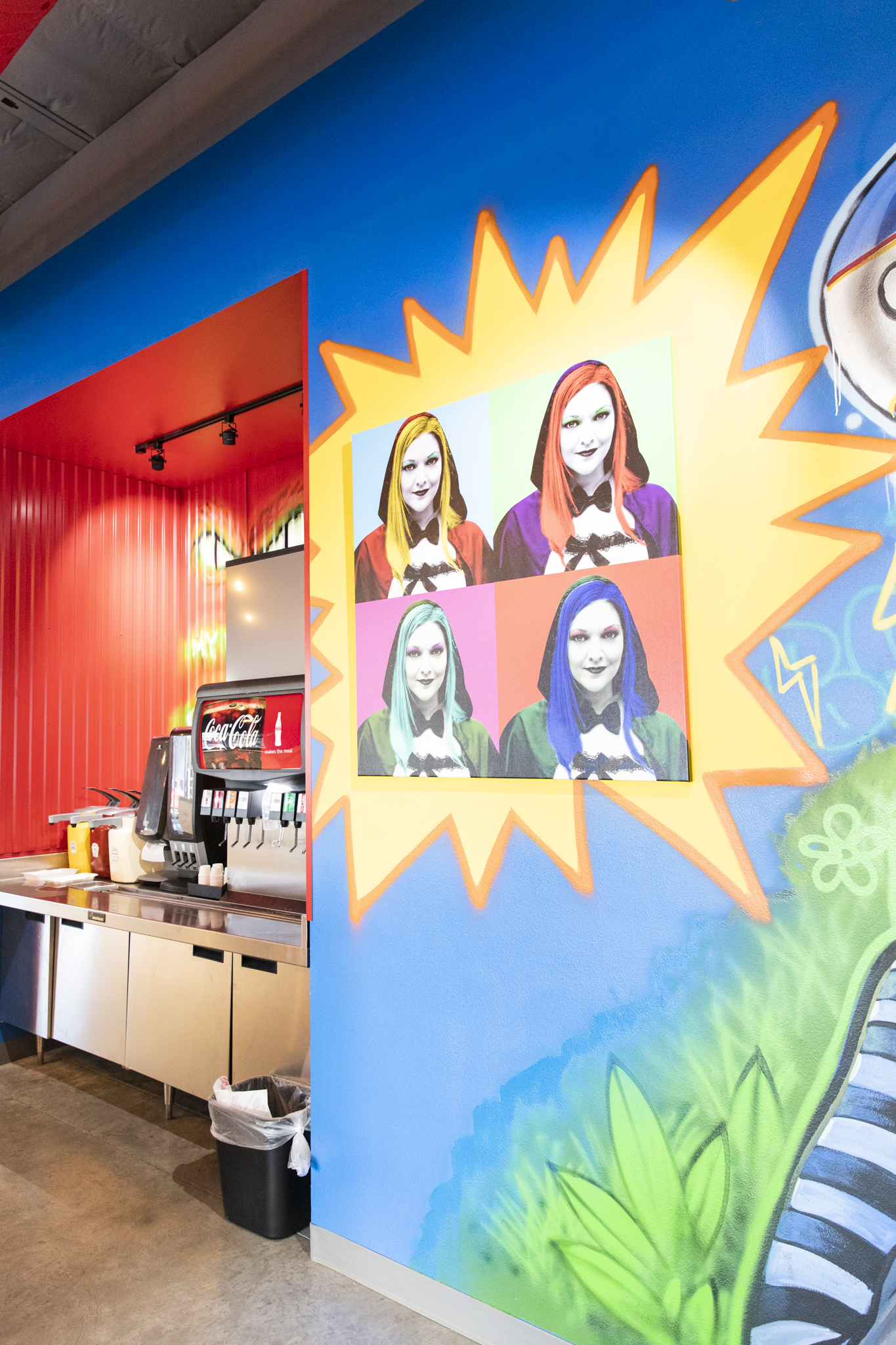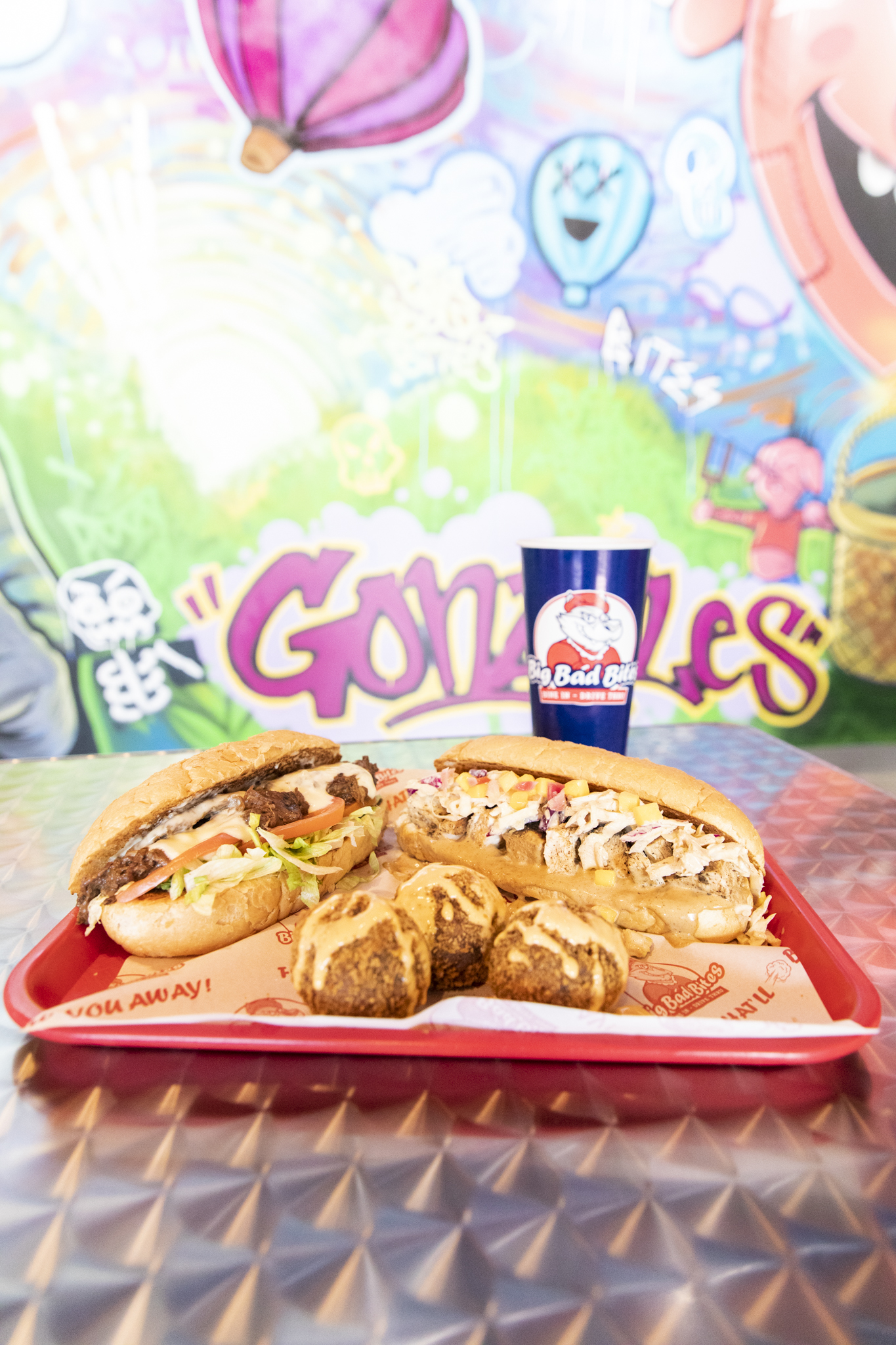 The interior of the restaurant is art-driven and youthful, and it finds its own ways to celebrate local talent. Under the exposed industrial vents and opposite the animation cells from classic Disney cartoons featuring the Big Bad Wolf sits a mural by Skinny Dope, a Baton Rouge muralist known for his work downtown. The mural combines elements of the restaurant’s marketing and the Gonzales community, including the town’s water tower.