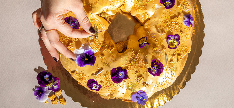 No surprise, king cakes are enjoyed in Louisiana throughout Carnival (and more recently, during other holidays) with wild abandon. One is never enough, not when there are so many variations. New iterations appear all the time, like this Queen Cake from Gourmet Girls, one of several specialty versions made by the Bocage catering company. In this elegant pastry, a homemade brioche ring is filled with Champagne mousse and sprayed with edible gold lustre and topped with edible flowers. “It’s gold, and different,” says Gourmet Girls owner Katia Mangham, “so why not name it ‘queen.’” gourmetgirlsbr.com