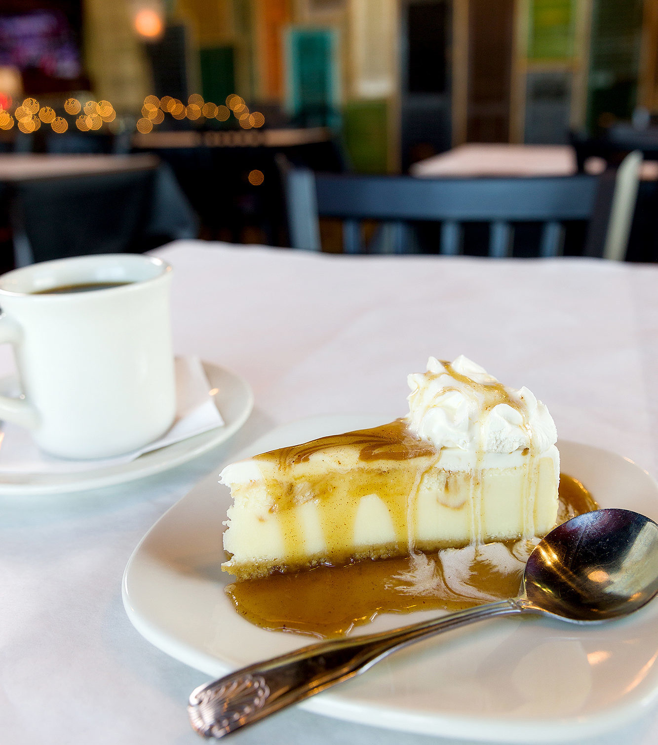 Too full to indulge in desserts, we took the Bananas Foster Cheesecake and Chocolate Obsession home to enjoy later. Both servings were diminutive slices, but the luxuriousness made sense as smaller portions. The velvety cheesecake had ample flavor, reminiscent of banana pudding, with a swirl of caramel throughout. Chocolate Obsession offered decadent layers of chocolate cookie crust, chocolate “decadence,” and dark and white chocolate mousses all crowned by chocolate sauce. Though it sounded too cloying to enjoy more than one bite, it was surprisingly subtle and worthy of its name—and a great ending to the meal.