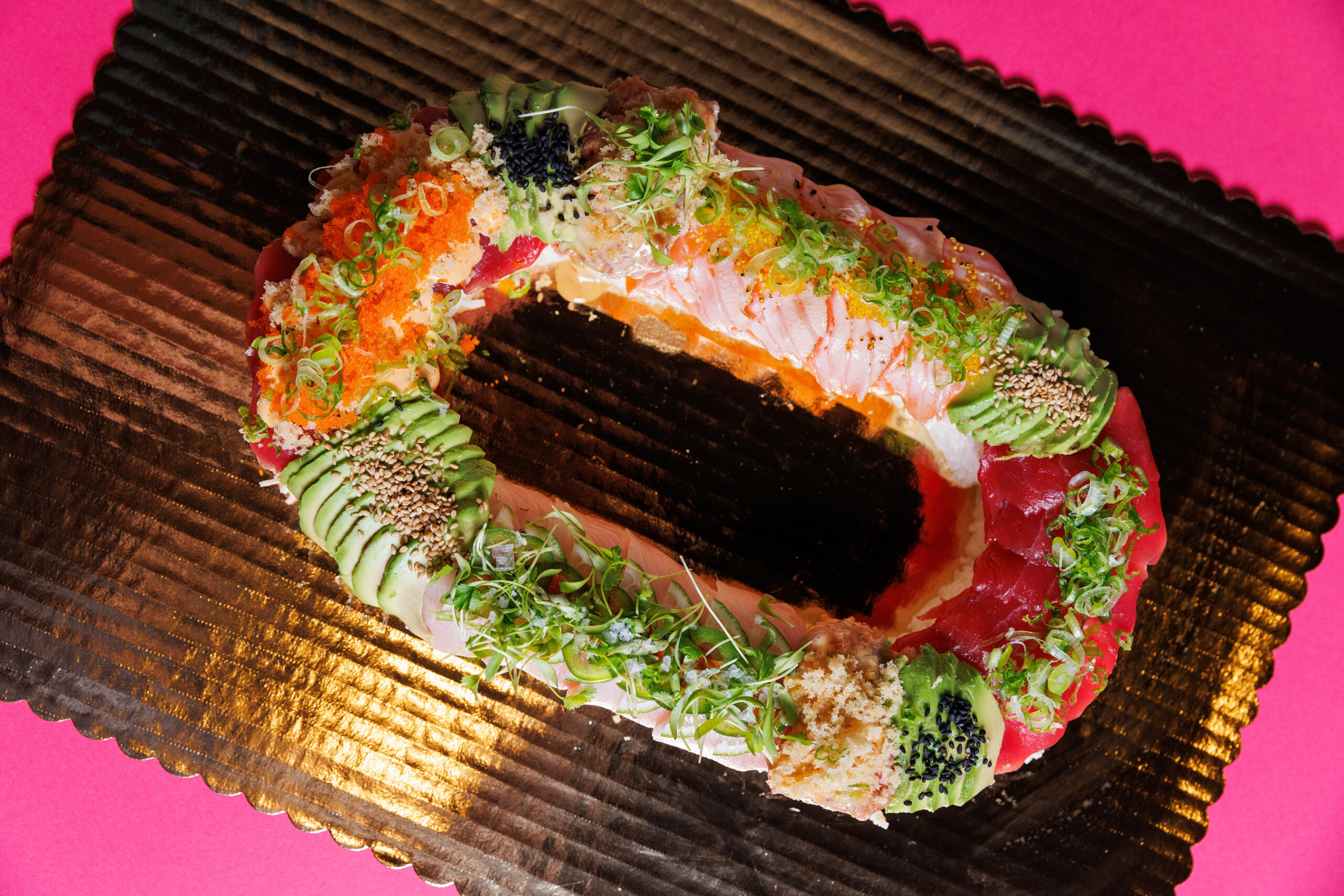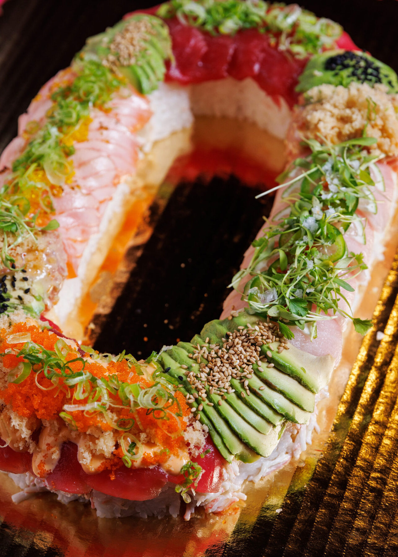 The cream cheese-filled rice “cake” is then artfully decorated in sections inspired by Rock-n-Sake’s most popular rolls. Each of the four corners is dressed with more krab and avocado. The remaining ends get generous layers of torched salmon, yellowtail and tuna—both sliced and spicy—along with toppings like tobiko, tempura flakes and jalapeños. Rest assured, the classic sushi sauces, ponzu, soy sauce and more, are served on the side with wasabi and ginger.