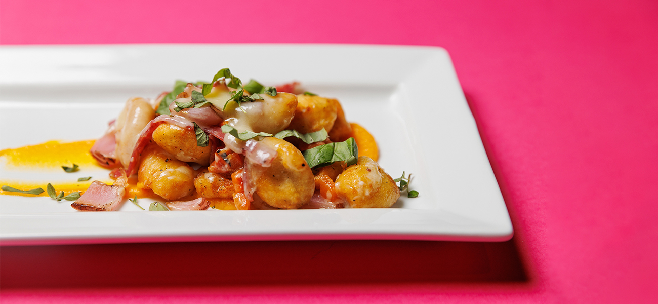 Today, that sauce is a butternut squash puree, coating poached-then-pan-fried gnocchi. It’s finished with grilled onion, roasted pepper, julienned salami, melted cheese and fresh herbs.
