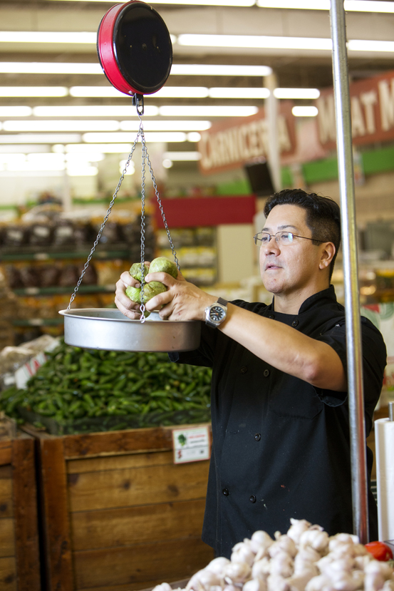 Mestizo owner Jim Urdiales weighs tomatillos at the Latin American meat market and grocery store La Morenita. Photo by Collin Richie
