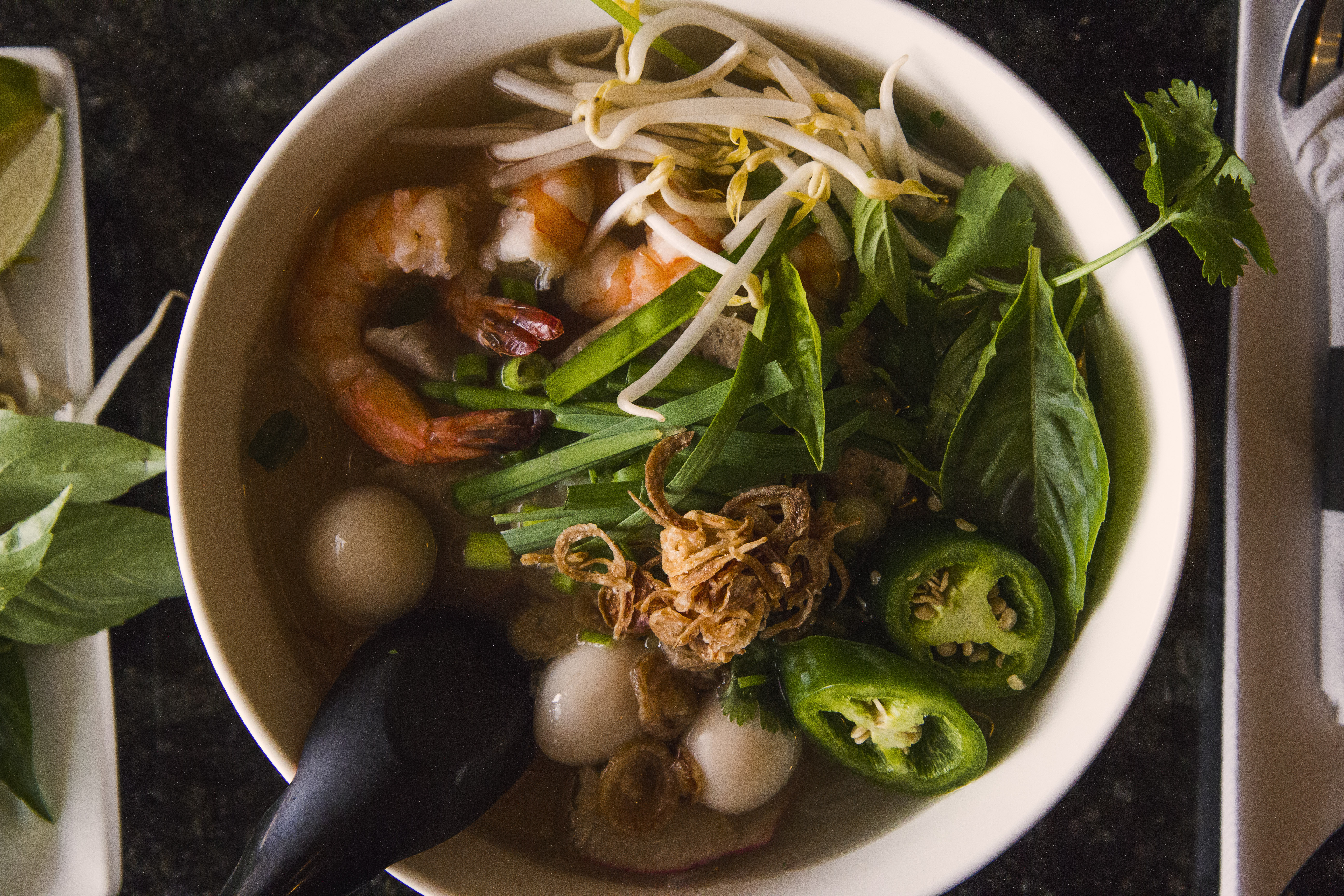 Noodle soups are a staple in Vietnam—and we’re not just talking about pho. Originally from Cambodia, hu tieu is one of pho’s lesser-known cousins. Find it on the menu at Saigon Noodles as Clear Noodle Soup. Get it combination style—with shrimp, barbecue pork slices, quail eggs, pork meat patties and cellophane noodles. Lime wedges, green onion, cilantro and chives pack a punch of fresh flavor. Crispy fried onions top it all off.