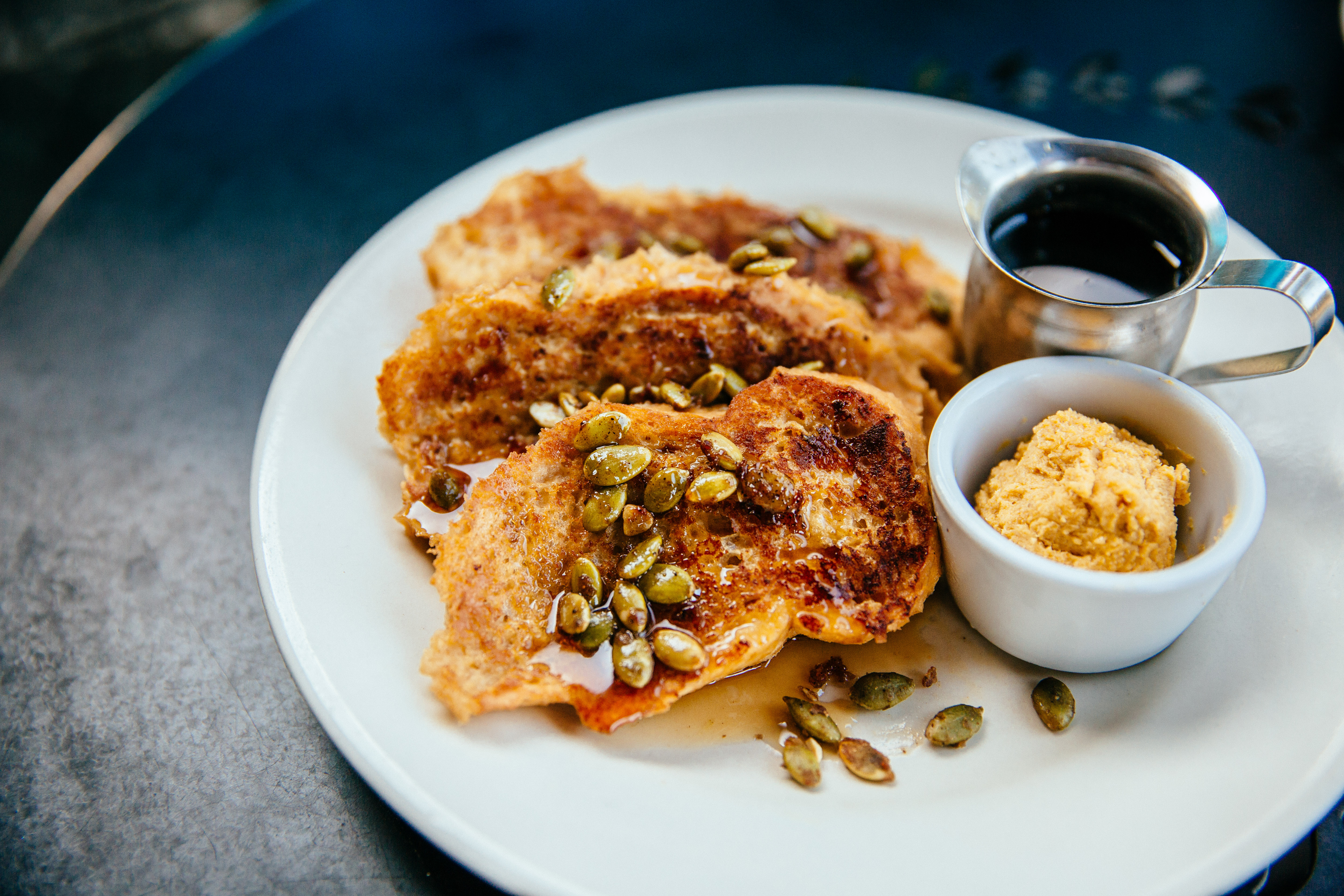 Once I got inside and placed the order, my eyes widened as the server brought a plate with three large pieces of toast garnished with green pumpkin seeds and sides of syrup and whipped pumpkin butter. My fall dreams were about to come true.
