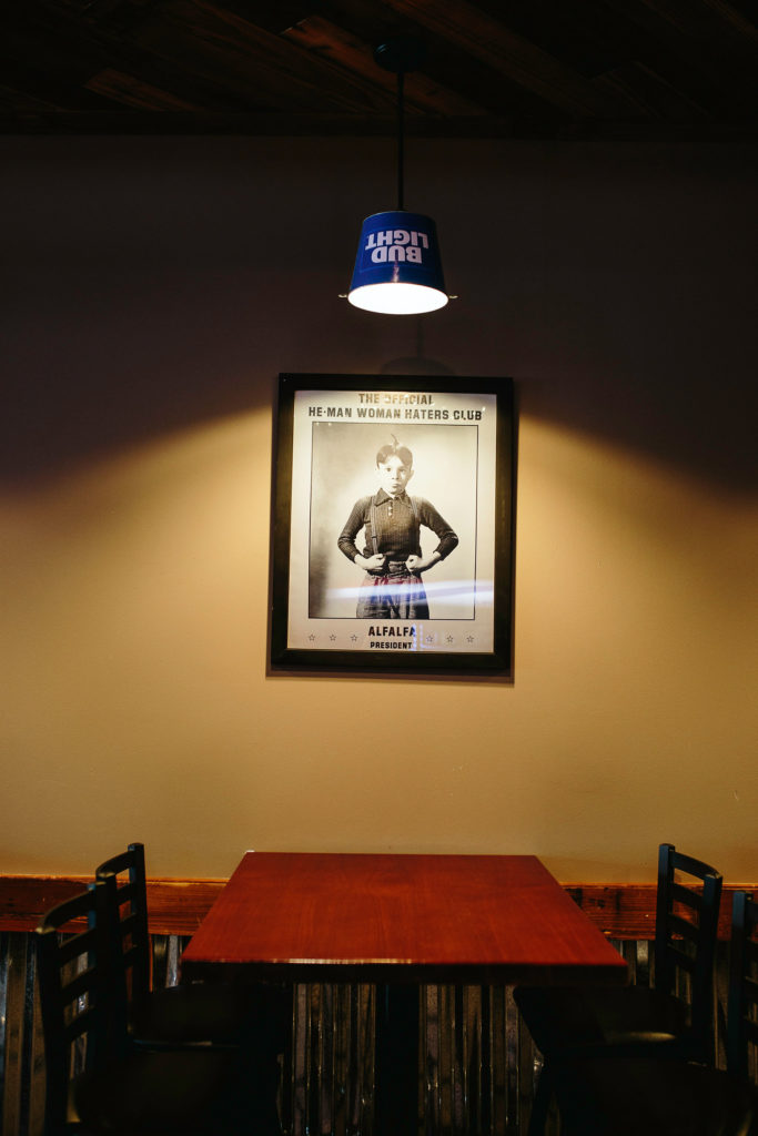 At Spanky’s, it’s the small touches that make the interior so special. There are black and white posters of characters from The Little Rascals mounted on the walls. Ice buckets from beer brands are used as lamp shades, and Christmas lights are strung over the bar, creating a warm and cozy feel. After grabbing a drink, customers can play darts and arcade games while catching up with friends.