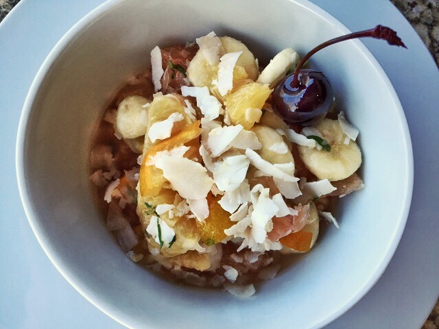 Section the grapefruit and oranges, removing pith, and add the sections to a medium bowl. Add the sliced banana, kumquats, coconut, honey and cherries. Stir to combine. Serve in small bowls and garnish with mint and more coconut.