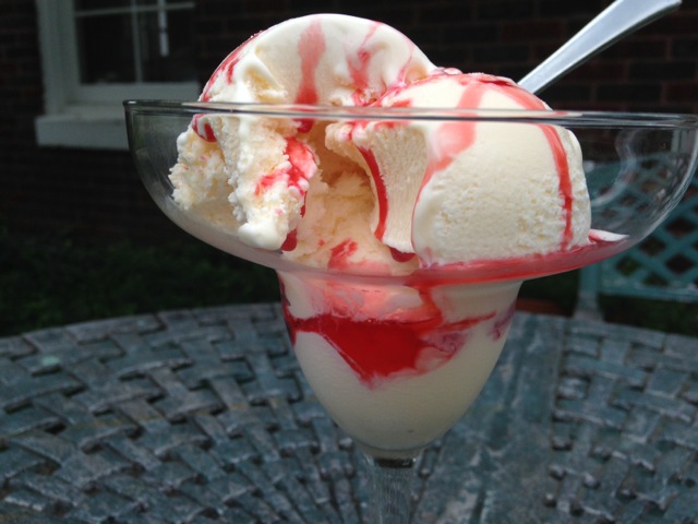 Strawberry syrup, like this, pictured above atop ice cream, is easy to make. Photo by Maggie Heyn Richardson.