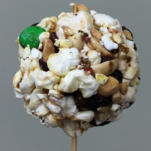 3. Scoop one-sixth of the mixture into a square of cling wrap, fold the cling wrap around the mixture and press it into a ball shape. (It helps to gather the four corners and twist like a candy wrapper.) Cut a skewer to the desired length, and press it into the popcorn ball.*** Repeat this process until all of the pops have been formed. The pops can be eaten immediately, but will stay together better if left to cool for 30 minutes.
