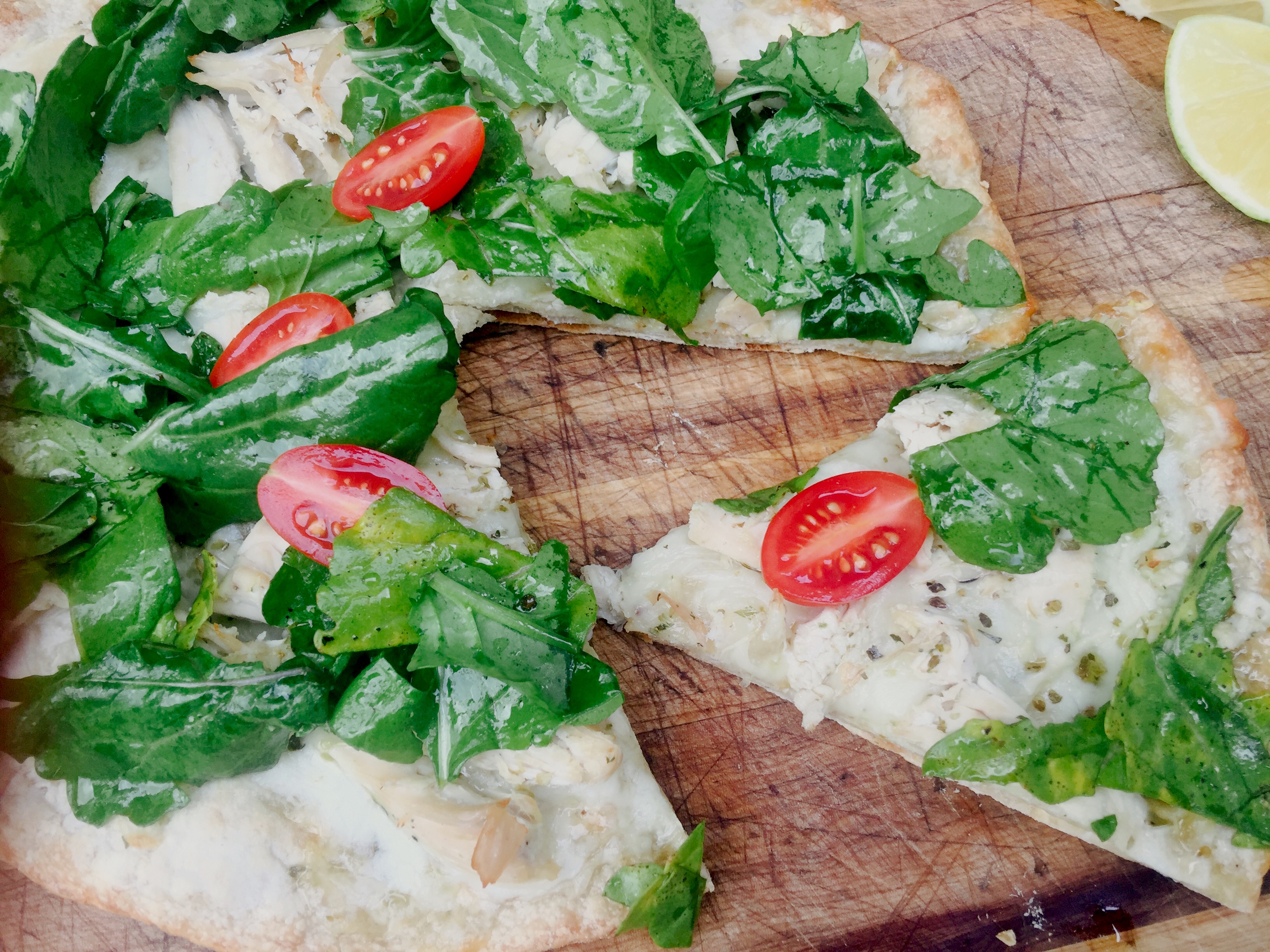 I absolutely love pizza topped with peppery arugula tossed in olive oil, vinegar and fresh lemon juice. Local Meyer lemons are in season right now, and they are totally amazing. So, I’ve created a pizza that pairs leftover turkey with fresh arugula, which also happens to be in season. The sauce on this pizza is straight-up olive oil and fresh garlic, and the cheese is mozzarella. But feel free to play around with your own preferences. As for additional garnishes, I’ve used fresh grape tomatoes here, but dried cranberries also work well.
