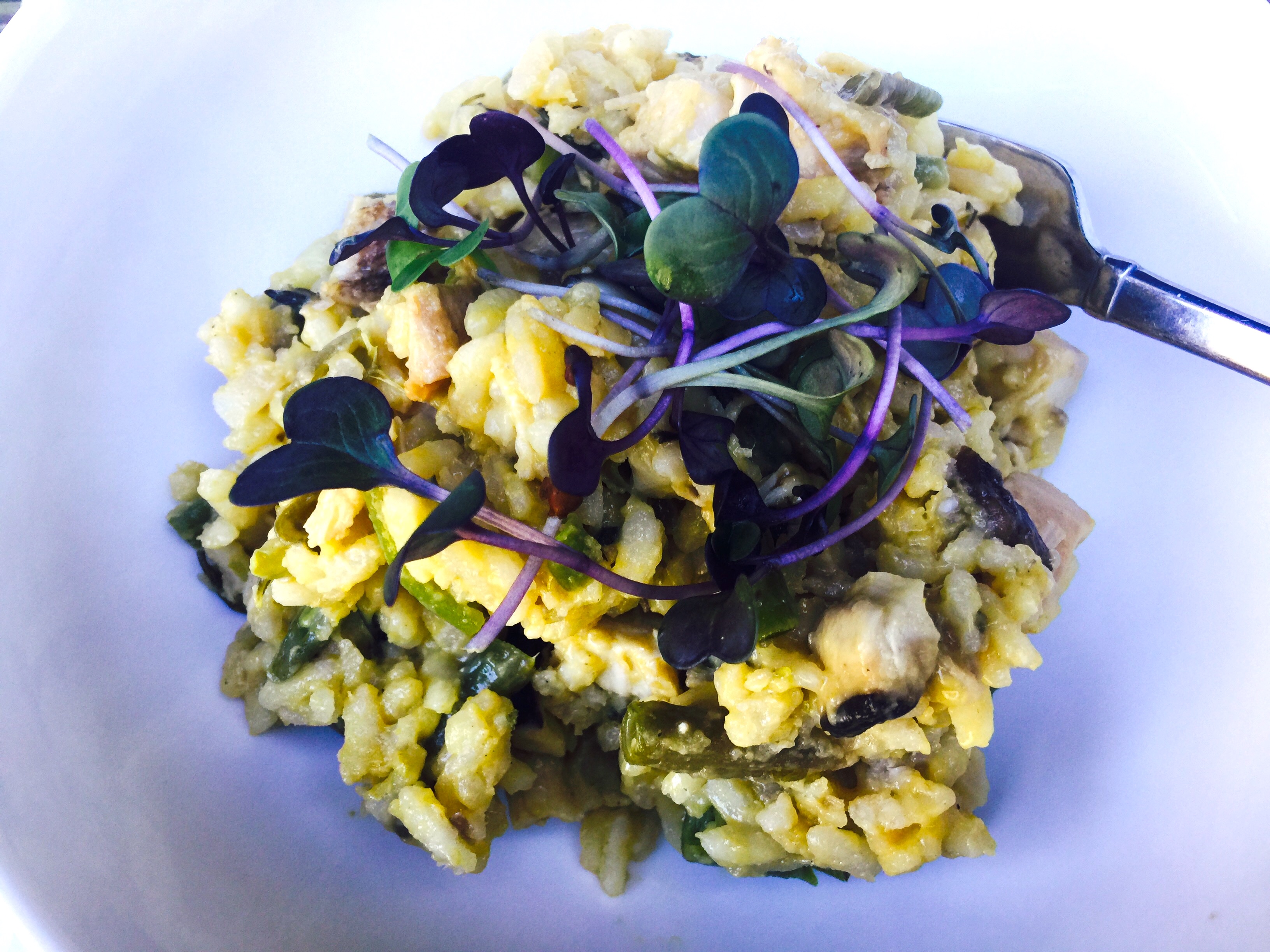 So, for my risotto this weekend, I incorporated the Westdome wild mushrooms, grilled chicken from the night before, fresh green beans cut into small pieces, fresh thyme and rosemary. Chicken stock and good Parm tied it all together. I topped it with some of Westdome’s slightly spicy radish microgreens for a fresh kick. It was homey and comforting and perfect with a green salad and glass of albariño.