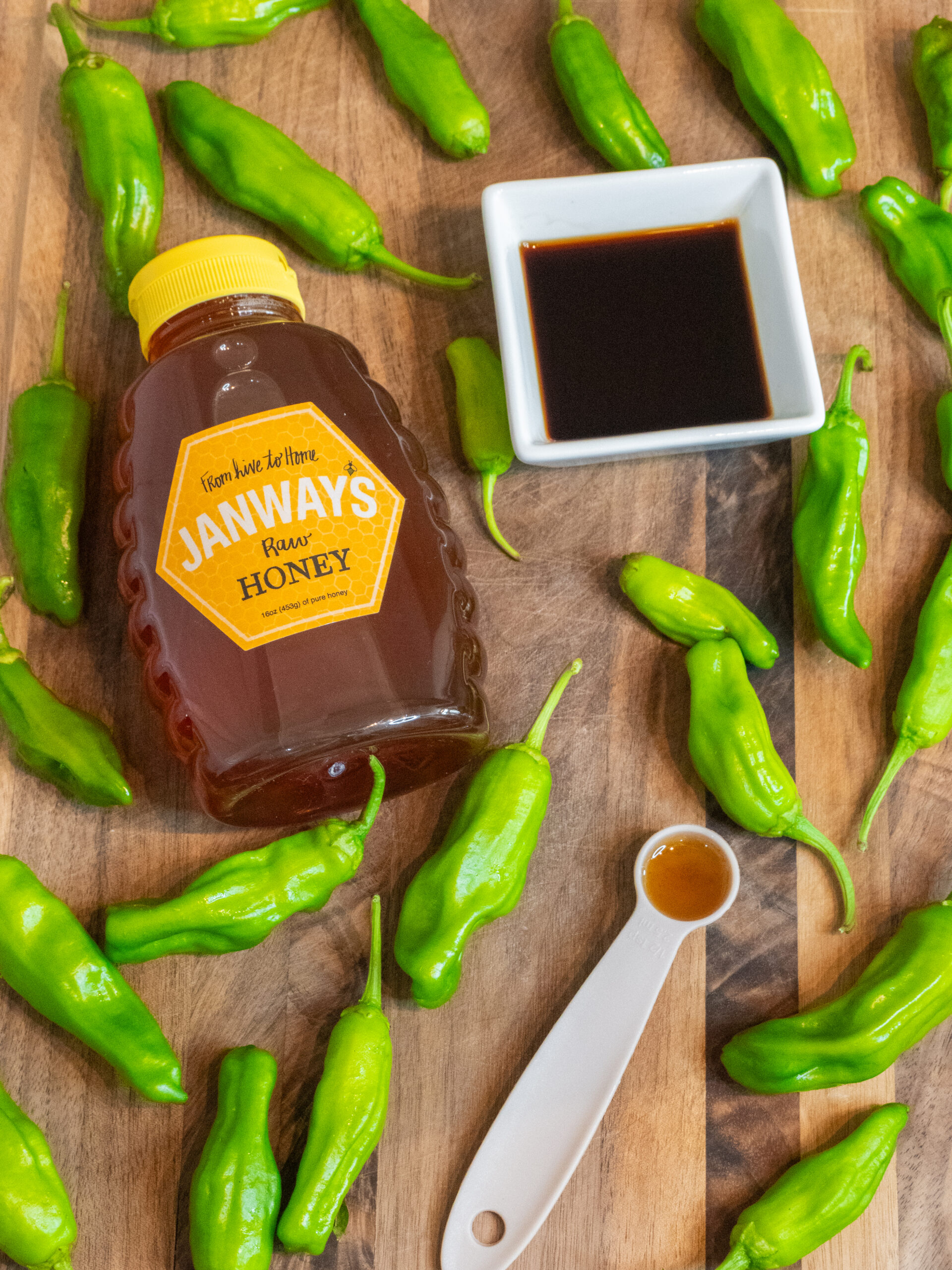 1. Heat the oven to 450 degrees. Toss the shishitos with the honey, soy sauce, sesame oil and a neutral oil. Marinate for 10-20 minutes.