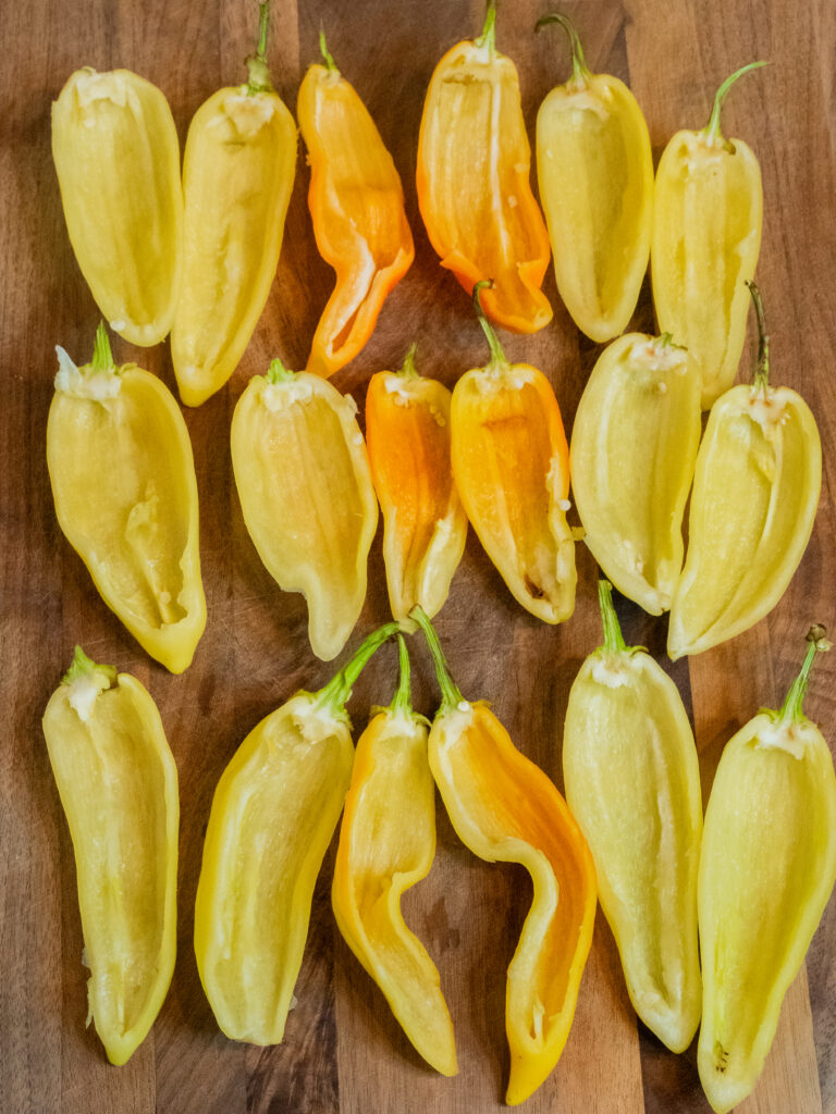 8-12 medium-sized peppers, like mini sweet peppers or, as pictured, 9 banana peppers from Lena Farms