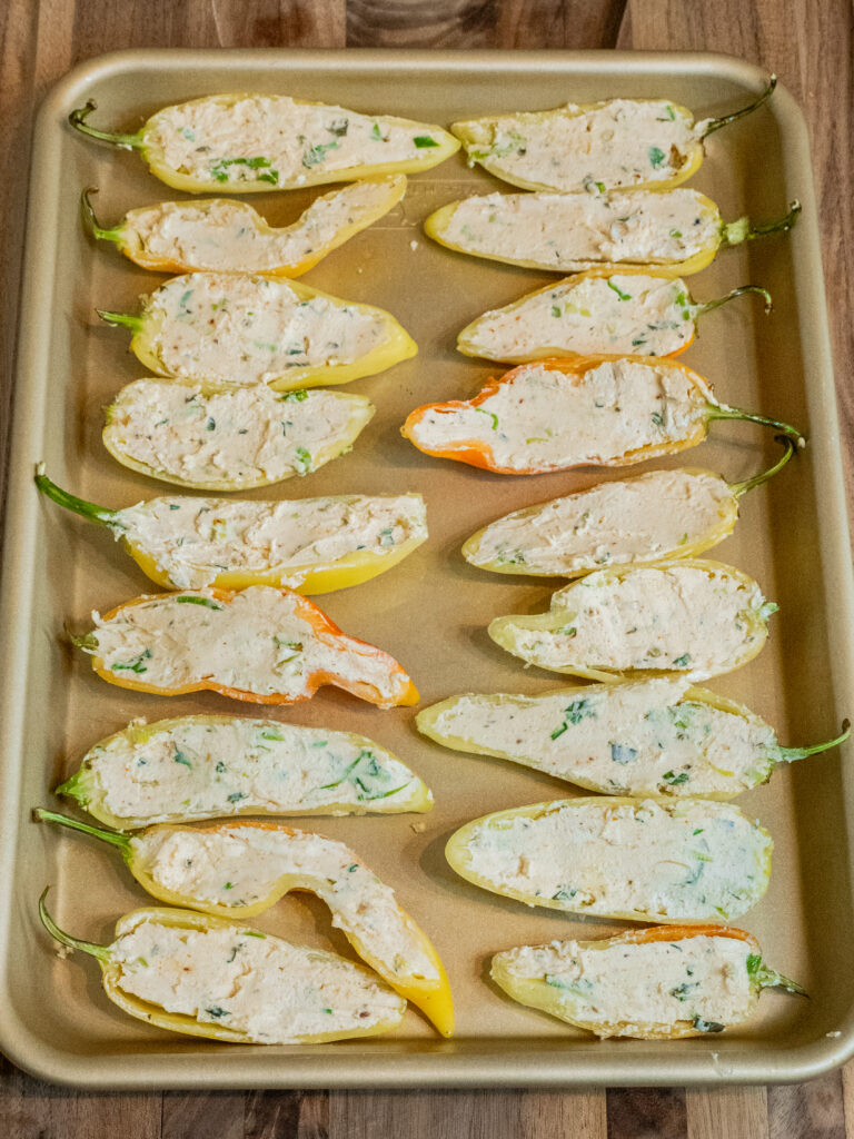 4. Spoon the goat cheese filling into the hollow pepper halves, fully filling the cavity.