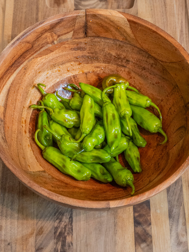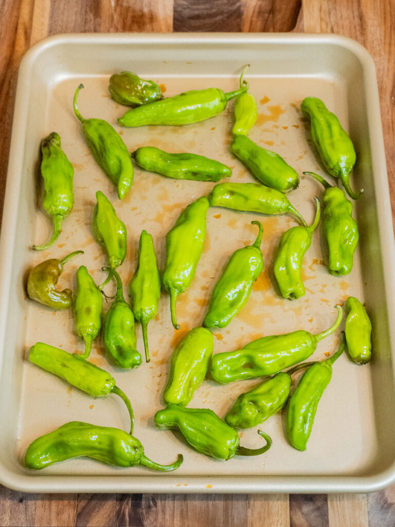 2. Place shishitos on a baking tray, leaving as much of the marinade in the bowl as possible. Bake for 10 minutes, flipping the peppers halfway.