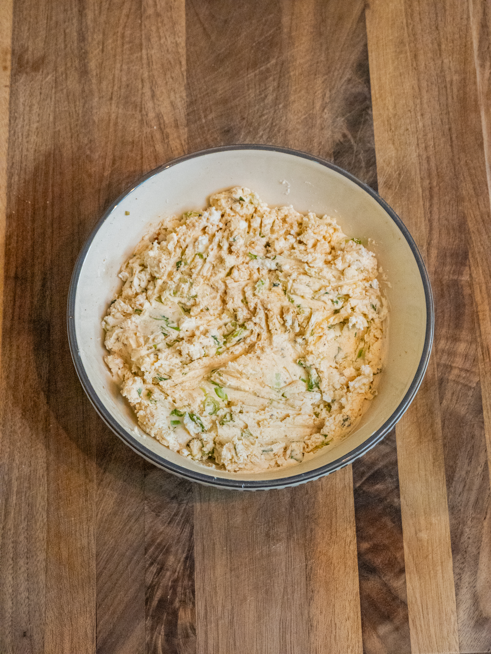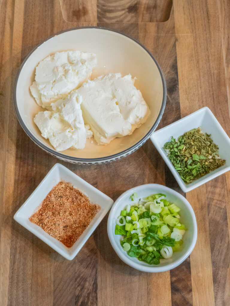 2. Mix the green onions, fresh and dry herbs, salt, black pepper, garlic powder, paprika and red pepper flakes to taste with the room-temperature goat cheese and room-temperature cream cheese.