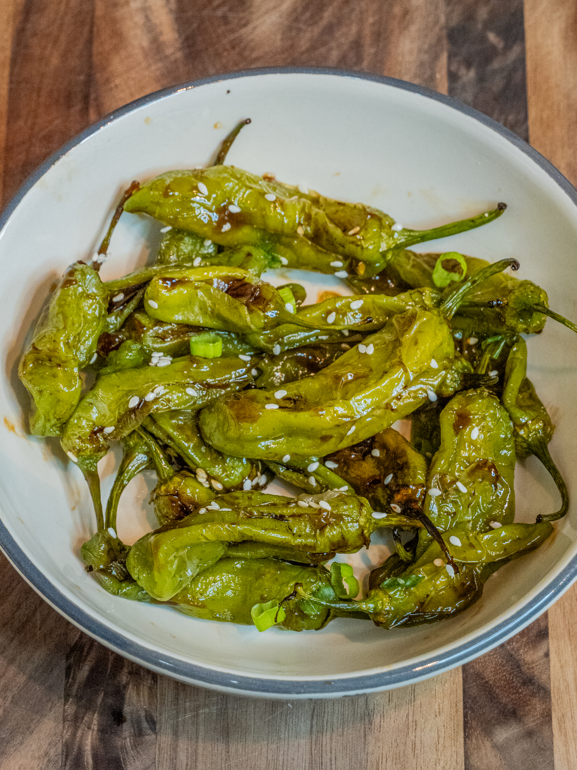 4. Once cooled, toss roasted shishitos in the honey sesame glaze with sesame seeds and green onions. Serve.