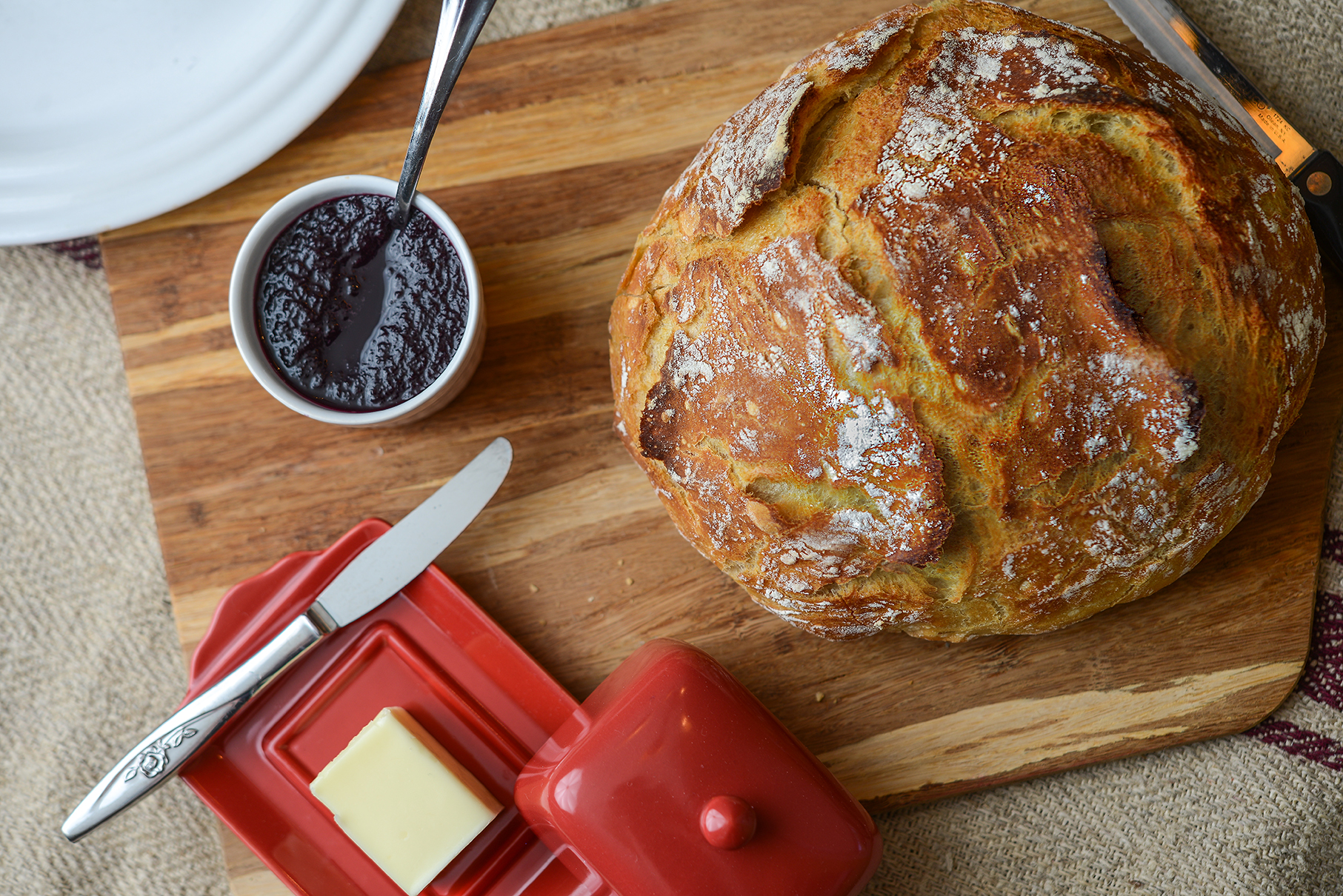 This bread doesn’t require kneading, and baking it inside a Dutch oven helps it steam—meaning you don’t have to spray water into the oven like with more difficult-to-make French-style breads. The bread bakes in about 30 minutes.