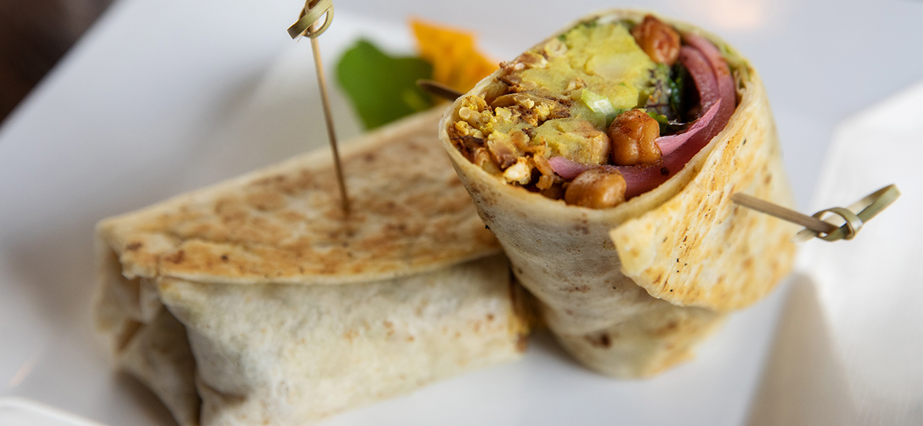 Curried potatoes, chickpeas, cauliflower, pickled red onion and baby kale in a toasted tortilla. cochabr.com
