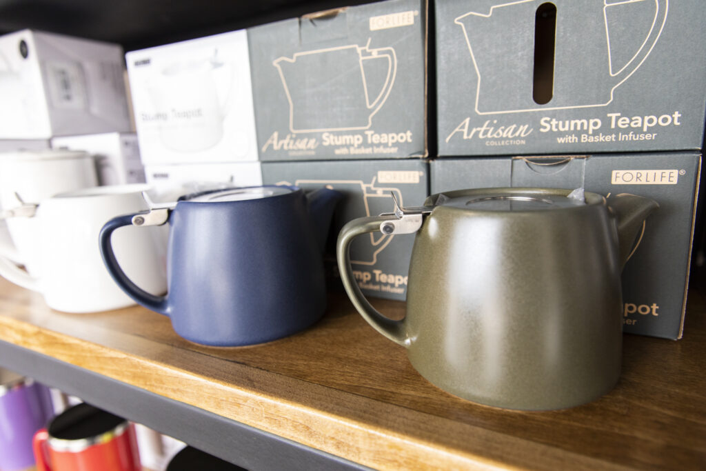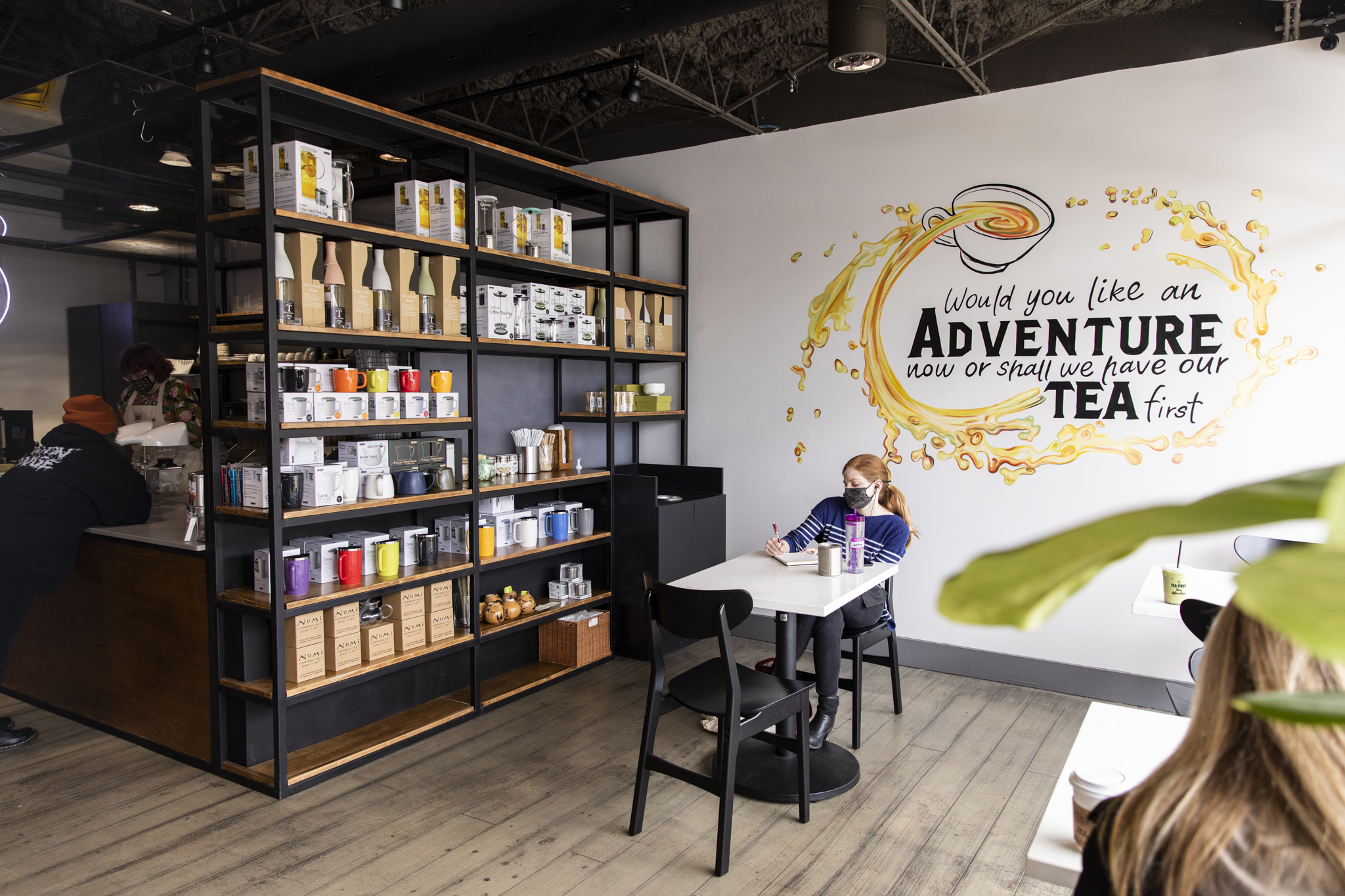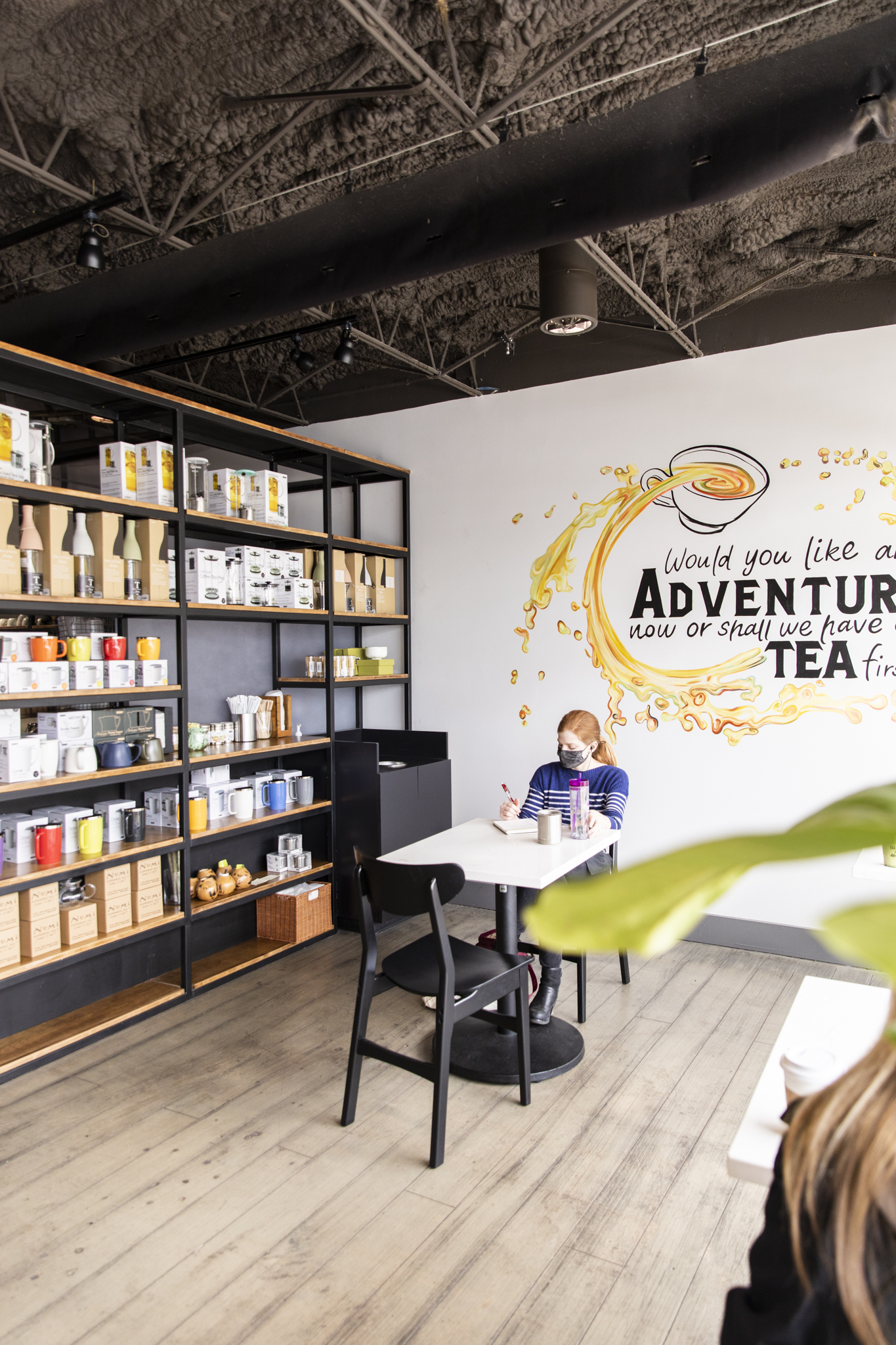 The cafe offers seating where customers can sip their drinks while logging some work on their laptops, as well as shelves stocked with tea blends, honeys, ceramic mugs, teaware and more available for purchase.