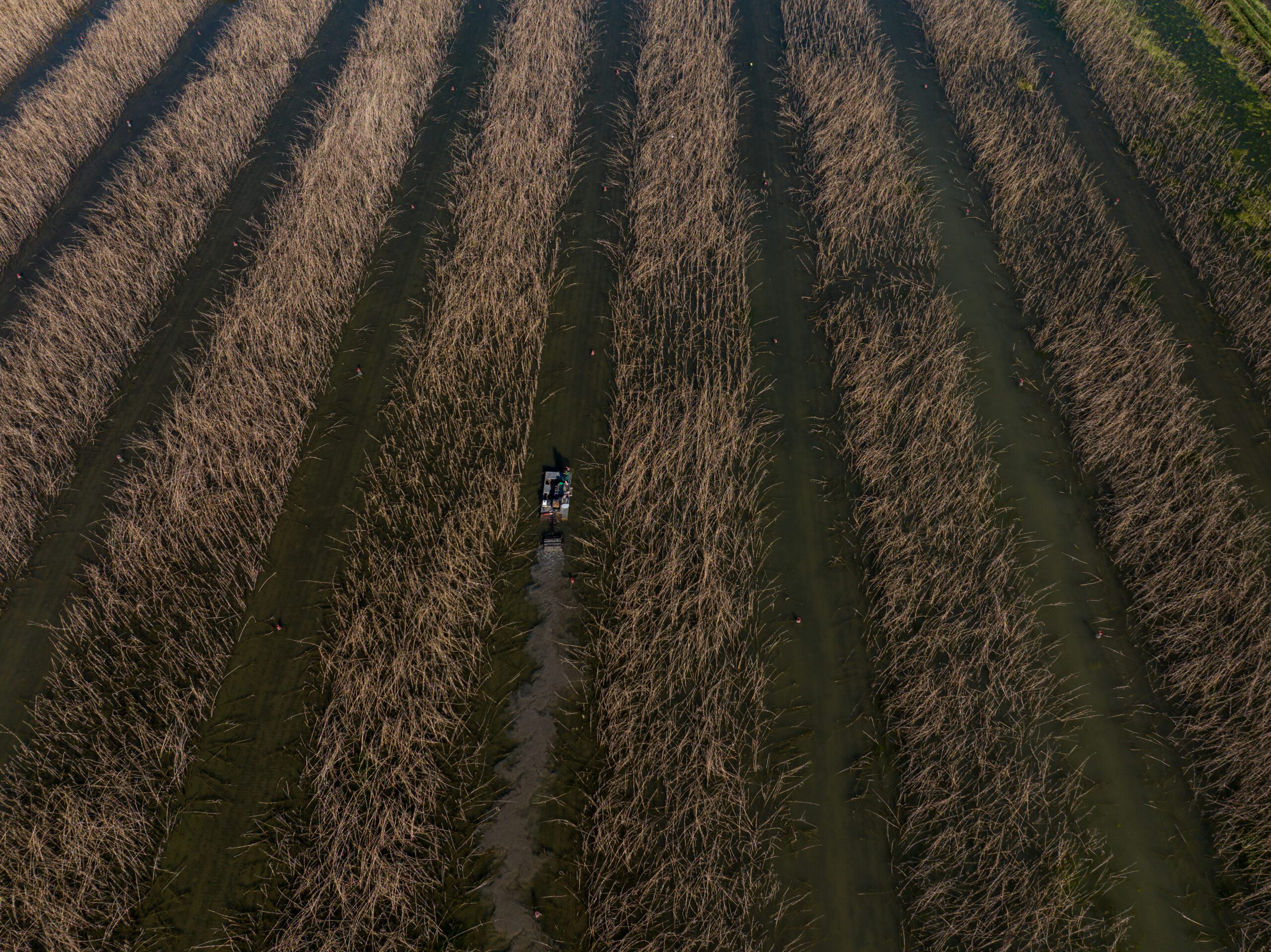The skimmer boat lumbers through the shallow, muddy pond as Cody and Samantha Carroll pull crawfish traps, moving from one red-capped mesh cage to another through marshy rows of sweet sorghum. They yank a trap up from the murky surface, dump its contents of writhing crustaceans onto the boat’s sorting table, and funnel them through a slot into an attached mesh sack. A new baited trap goes into the water, part of a rhythmic process set on repeat for the rest of the day.