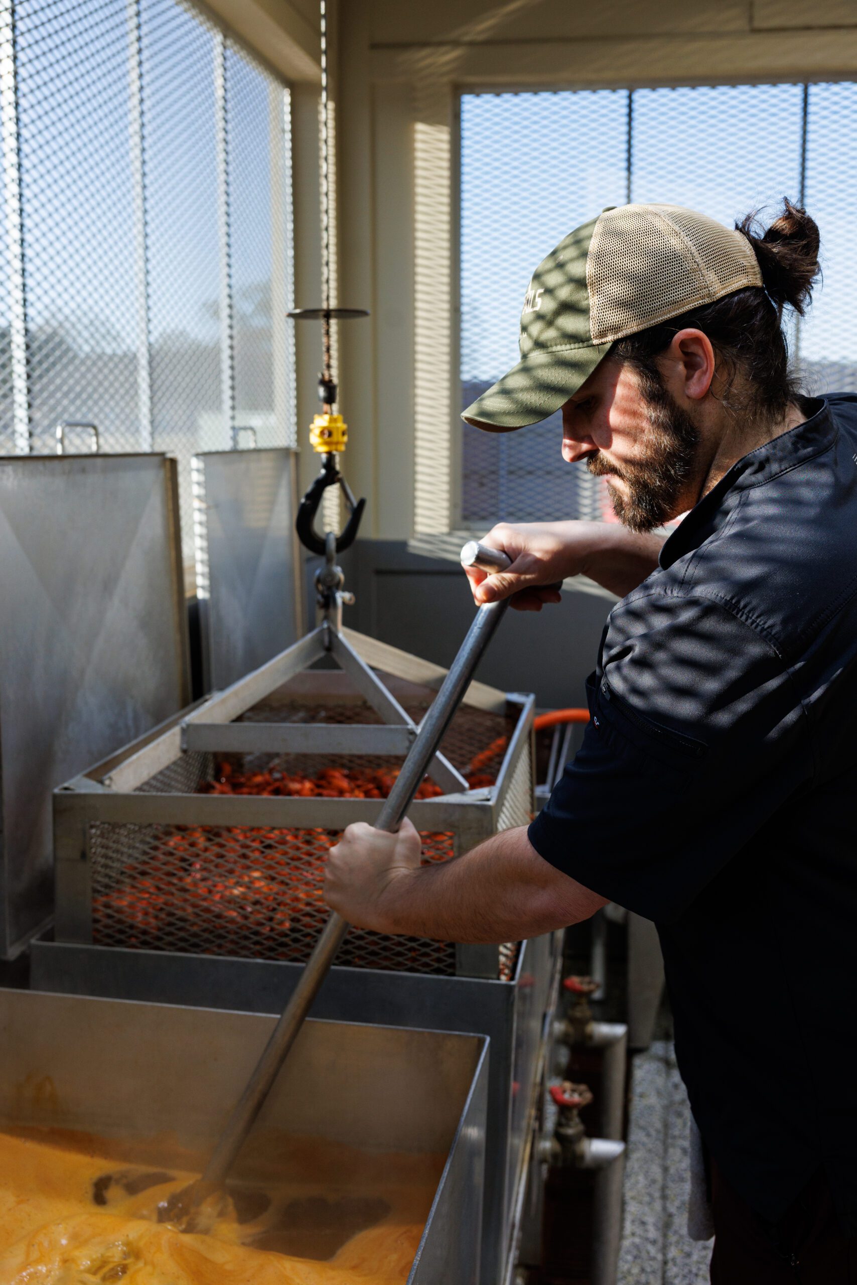The boiling rooms at Hot Tails deploy military precision, thanks to a design Cody perfected over the last 20 years. He empties three sacks of live crawfish at a time into an elevated rectangular vat of clean water for purging, or clearing, the crawfish. Oxygen is piped in from below, energizing the creatures. Their movement helps knock off additional debris. Once this stage concludes, a motorized claw reaches down from the ceiling and lifts the basket, then lowers it into an adjacent vat of boiling water. Backyard boilers accustomed to manhandling heavy rigs would be green with envy.