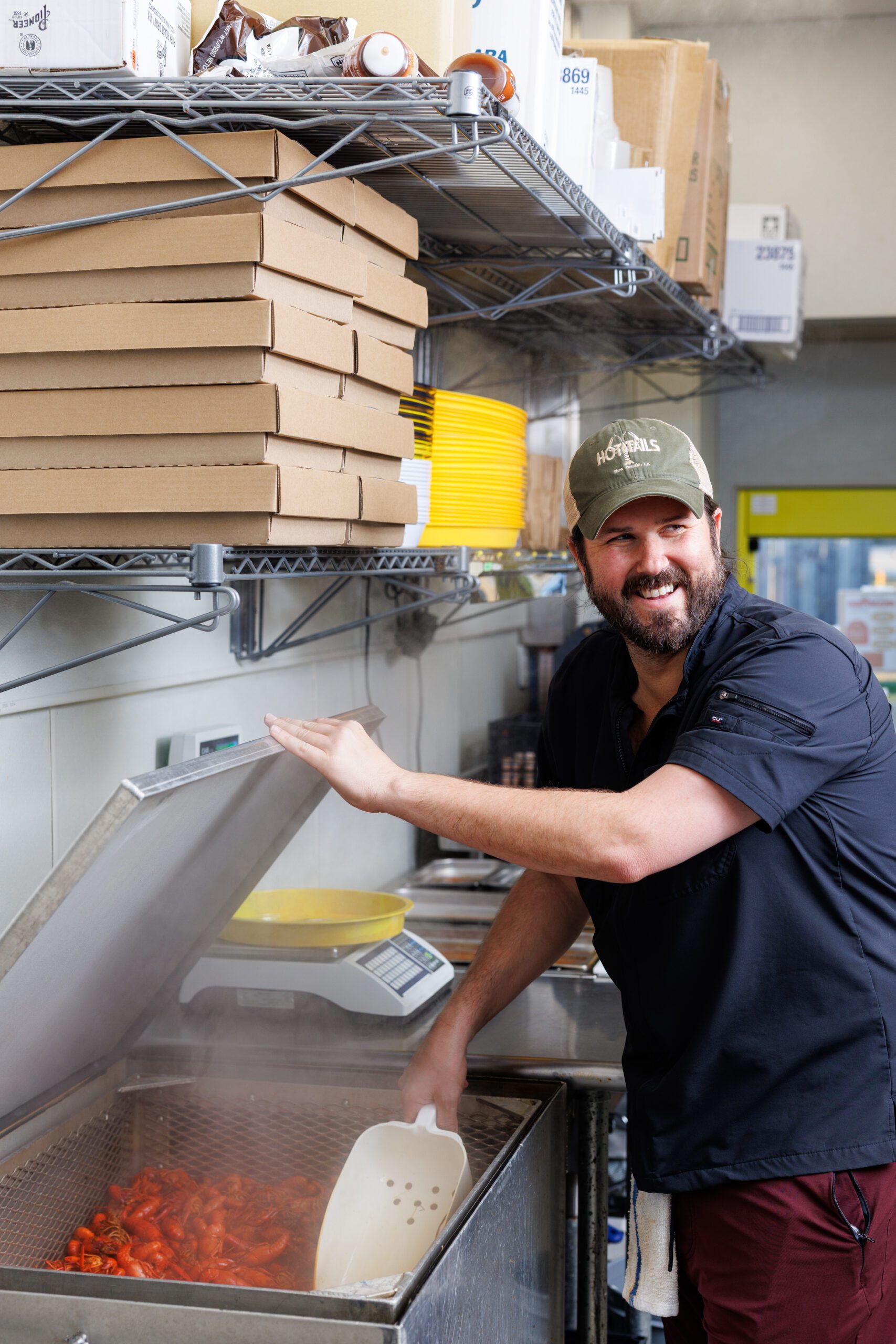 Again, the overhead claw lifts the now-finished crawfish, lowering them into a wheeled stainless-steel cart to be moved into the restaurant’s kitchen. From there, employees scoop up crawfish for countless leak-proof to-go boxes for the bustling drive-thru window and for trays for dine-in customers.