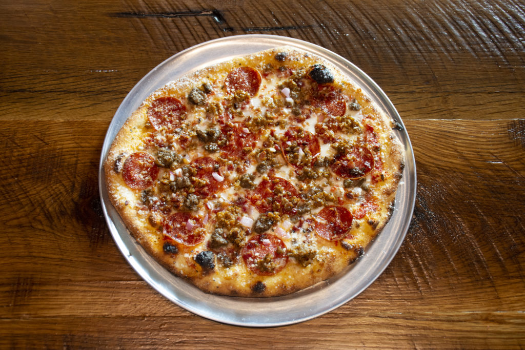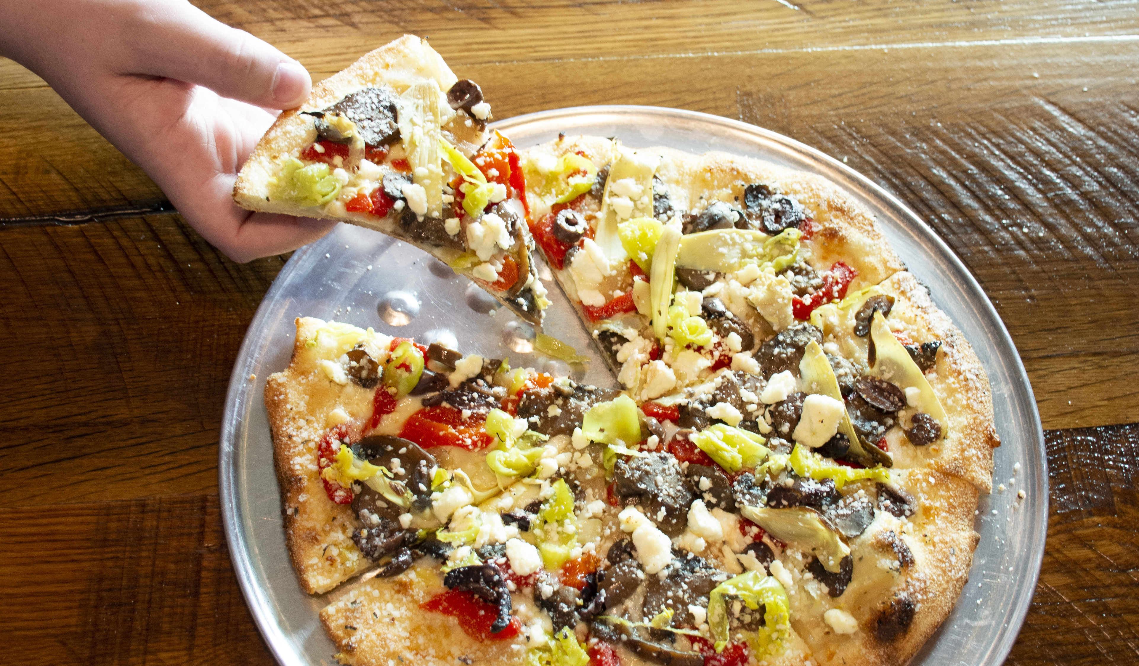 The eatery’s most popular pizza is The Beast, a classic pie made with red sauce, mozzarella, pepperoni, spicy sausage, red onion, meatball and bacon. But Perkins says a close second favorite is an all-veggie pizza called The Mediterranean.