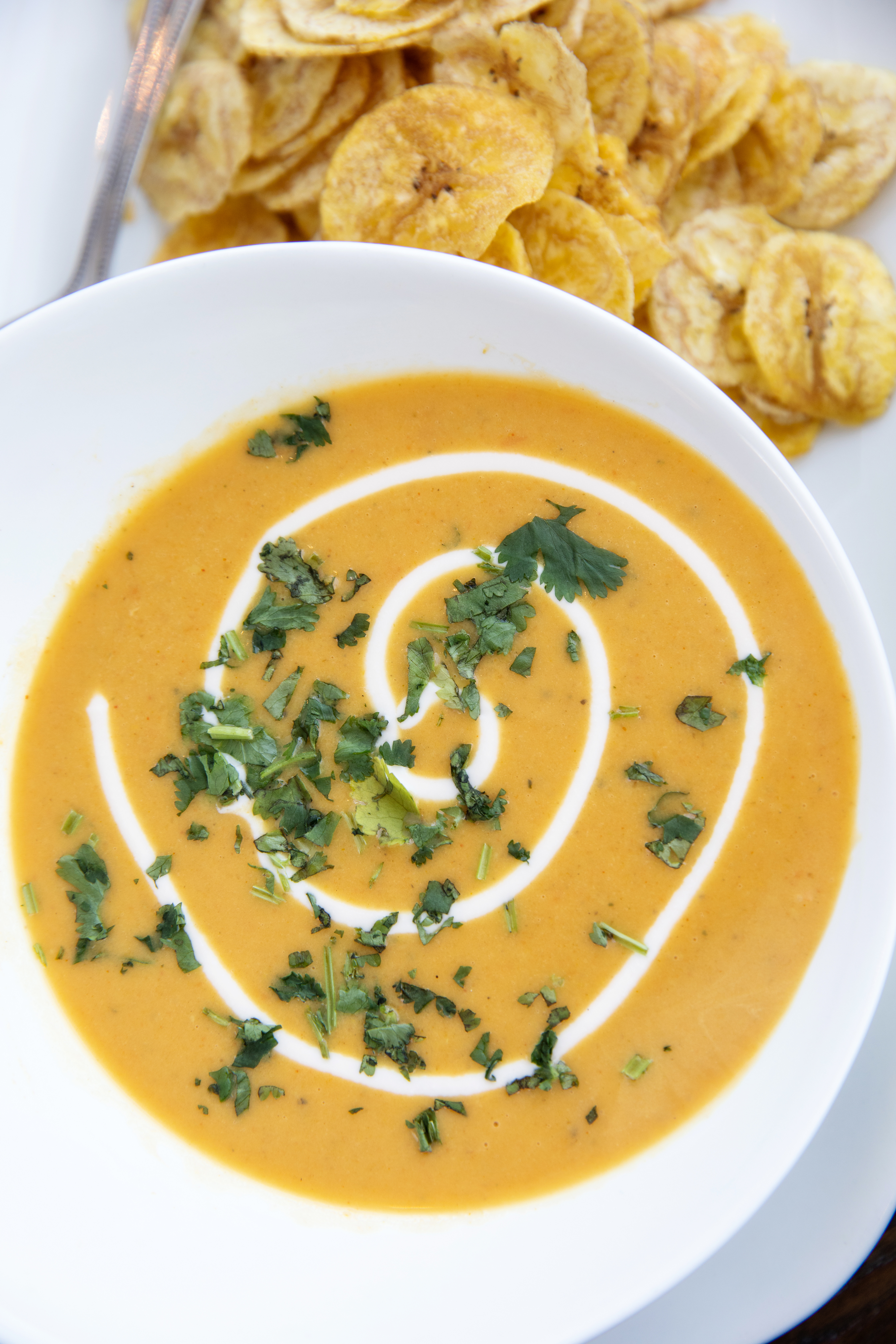On left: The Sweet Potato Coconut Curry offers sweet and spicy flavors in a creamy and comforting soup.