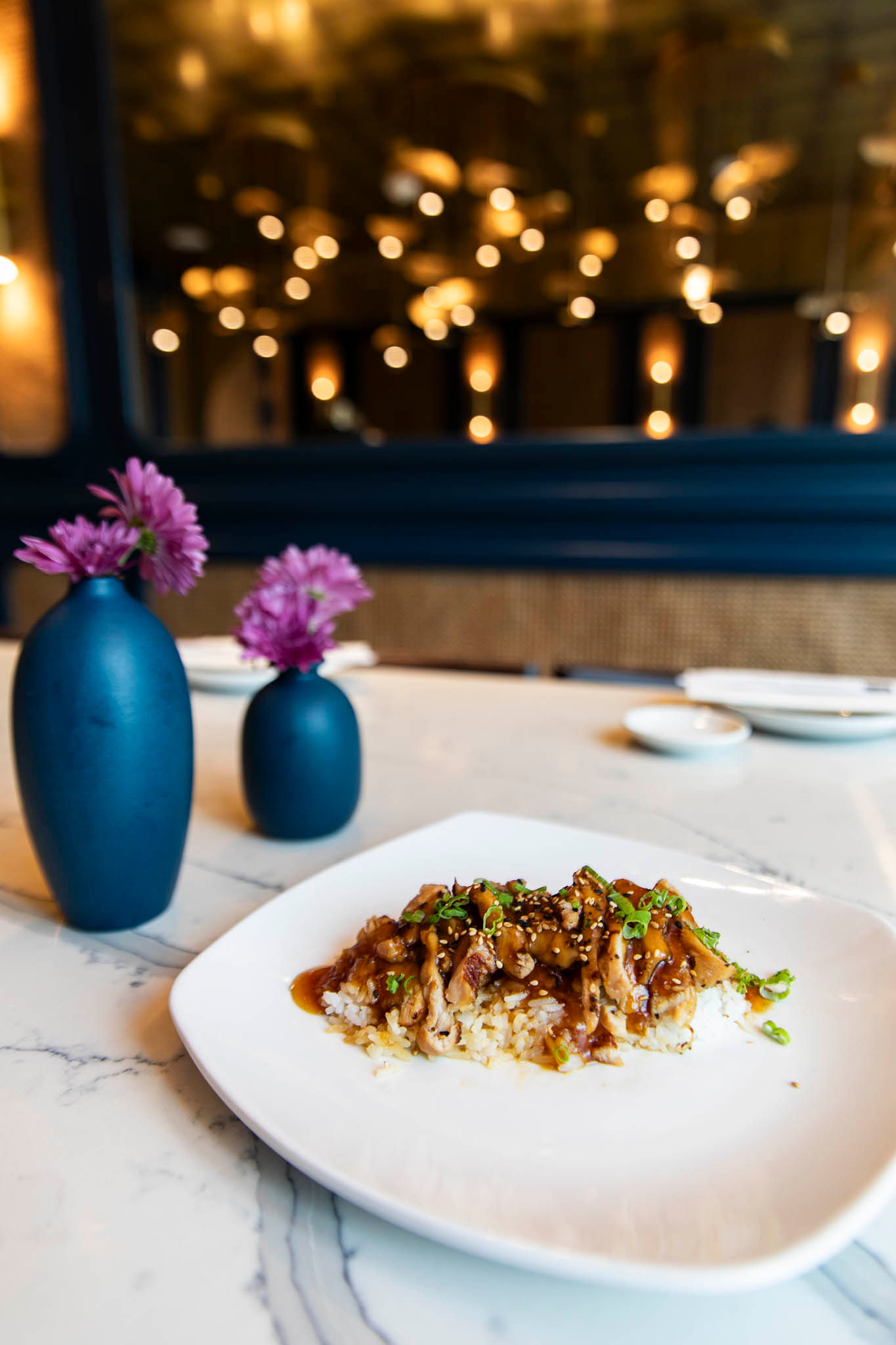 The two semi-private spaces have their own vibes with muraled walls, pops of rattan for added texture and unique light fixtures, including one fashioned like a dangling cluster of lily pads. The rooms are dubbed “semi-private” because they lack doors and other patrons may be seated in the area if tables are available.