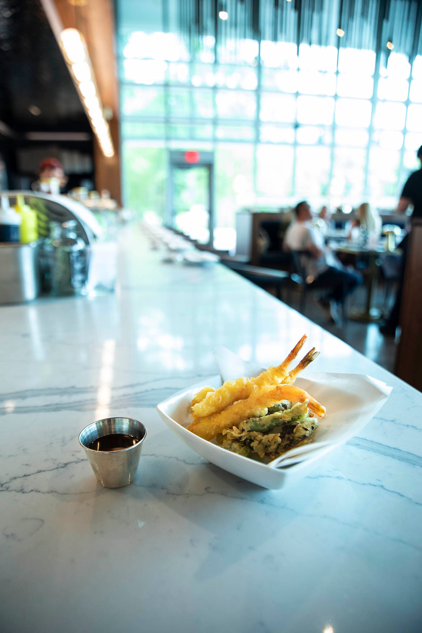 Tsunami brought in local design firm Tiek Byday for the architecture and interior design. Bridget Tiek, one of the firm’s principal interior designers, says eagle-eyed patrons can spot Asian-inspired features like custom-made lamps and a wood wall modeled after Japanese joinery.