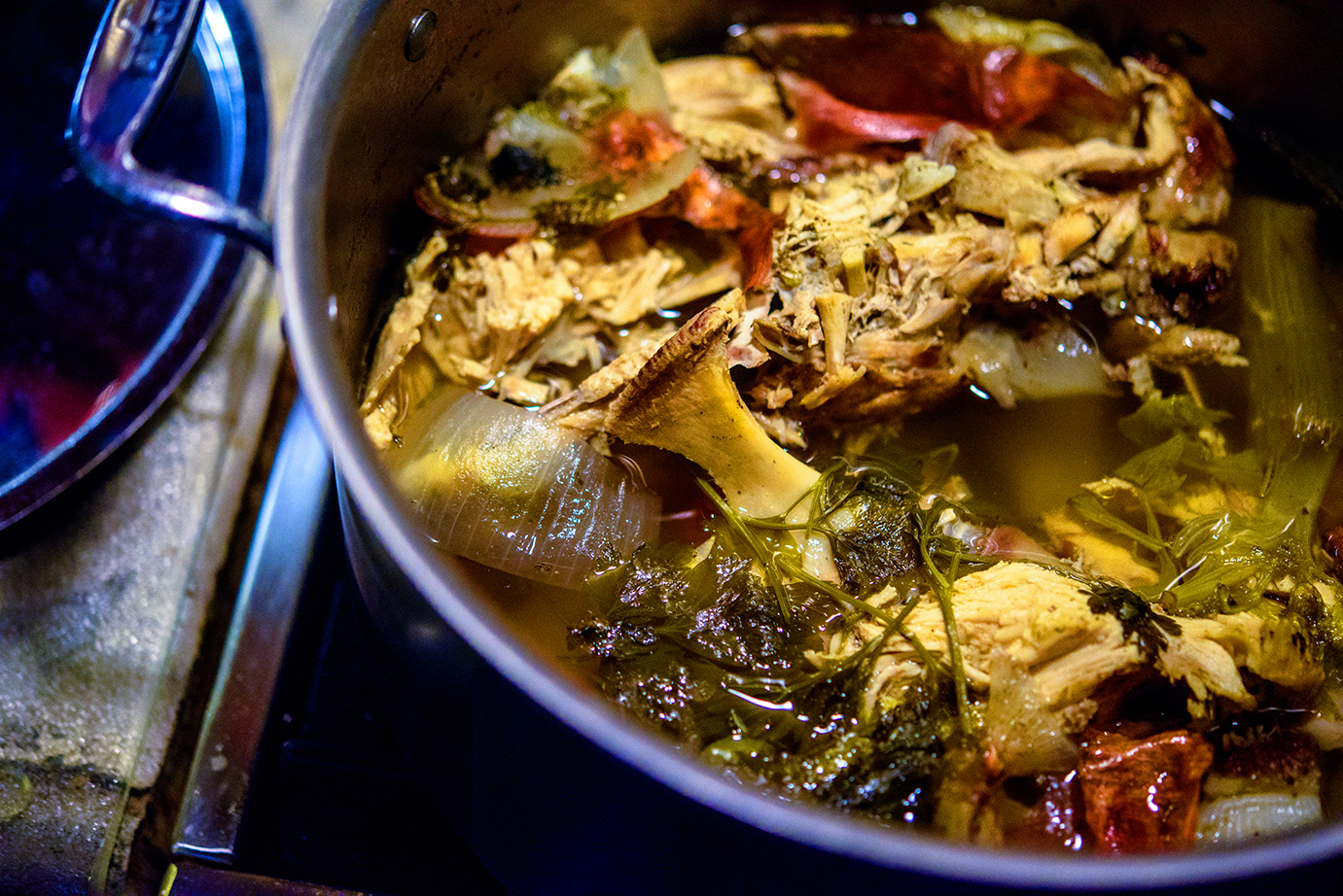 Turkey carcasses are not a problem. They’re a solution and the base for many wonderful gumbos, soups, stews or our favorite turkey pot pie (the recipe follows). We start by dropping the carcass into a big pot and covering it with cold water. Throw in some aromatics like onion, celery and carrots, and begin simmering. You can add some salt and black peppercorns along with fresh herbs and then forget about it for a couple of hours. Also, feel free to adjust the seasonings to your family’s tastes.