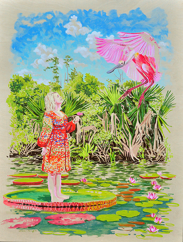 “In ‘Synchronicity Swamp,’ an homage to feminine power and a call to peace, I depict my dear friend and art school classmate Meghan Methe. We met at LSU 13 years ago and are both actively pursuing art. While [I was] traveling with this painting from New Orleans to Baton Rouge, a roseate spoonbill (the pictured bird) flew over my car.”