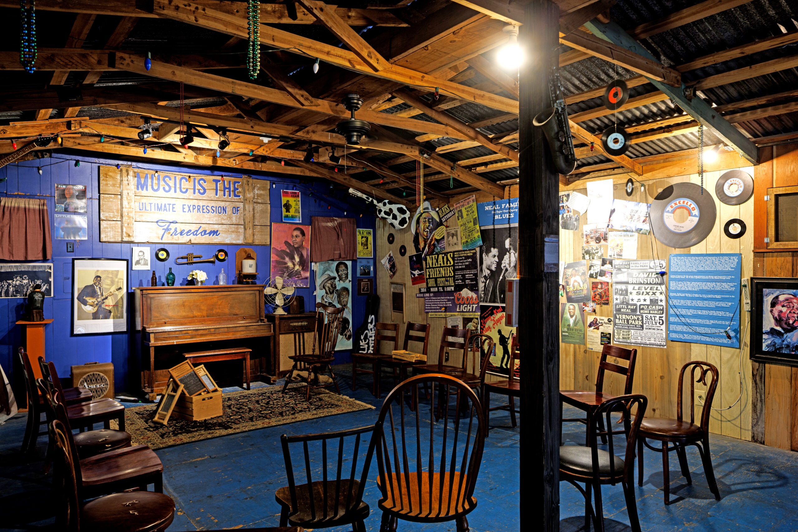 Purposely left unairconditioned, the space replicates a Southern juke joint, complete with an upright piano, jukebox, guitars, a bar and memorabilia, much of which was donated by the Neal family, best known for blues musicians Raful Neal and Kenny Neal.