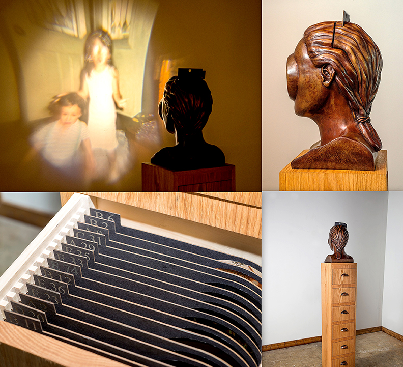 One such piece is “Days of Paradox,” an interactive bronze bust on top of a small filing cabinet that is filled with slides. Once the slides are inserted into the bust, the images are projected through its eyes.
