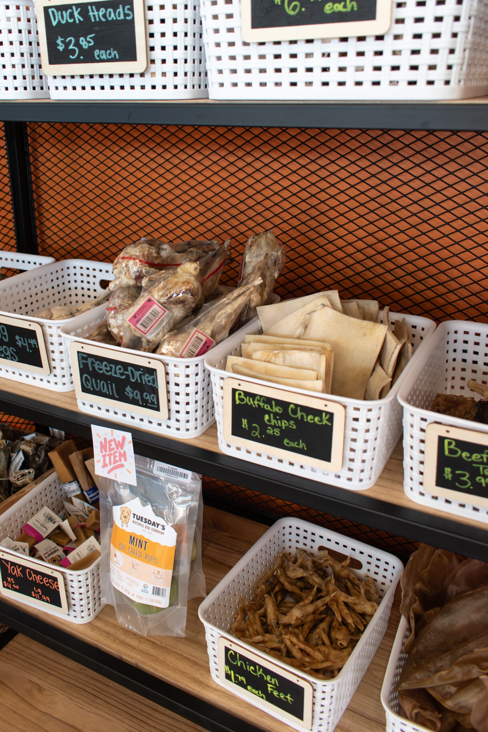 One of the store’s biggest draws, Kipps says, is its bulk treat wall, where owners select from what seems an unusual collection of goods. Bins hold dried duck heads, cow ears, beef tracheas, chicken feet, buffalo cheek chips and other natural treats. Gothic sounding as they are, such options appeal to pet owners looking for healthy alternatives to synthetic rawhide, Kipps says.