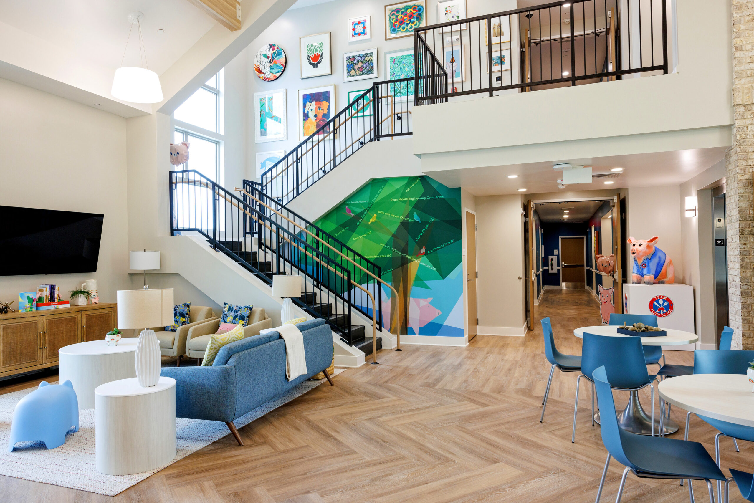 With 12 private rooms, a guest kitchen, a backyard, a laundry room, a communal lounge and a dedicated staff, the space provides a comfortable setting for patients’ caregivers. The interiors are cheerily decorated, in contrast to tight, sterile hospital quarters with a foldout bed. Rooms can accommodate three, with a queen-sized bed and a twin bed, allowing some to travel with siblings or grandparents for additional support.