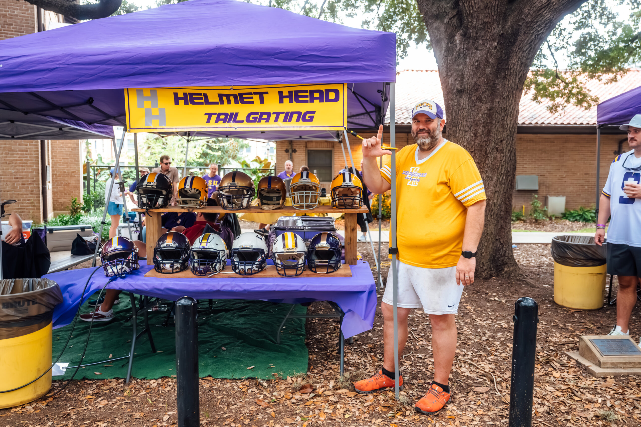 England, a 25-year tailgate veteran, heads up Helmet Head Tailgating, so named for his personal ritual of wearing a football helmet from kickoff to the last play. Rows of gleaming purple and gold helmets are also part of the gathering’s decor.
