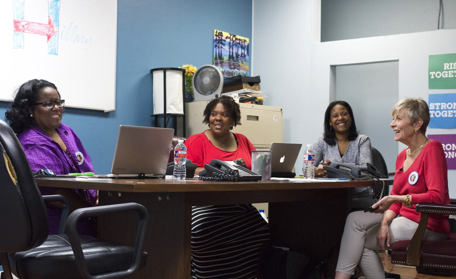 She’s one of many volunteers who phonebank for Hillary Clinton from this office, calling homes in the state and across the country to make the pitch for Clinton and help people register to vote. Her fellow volunteer, business manager Hollis Baker-Graves, recently spoke to an energetic 76-year-old woman in Orlando who wanted to know where to find the nearest rally.