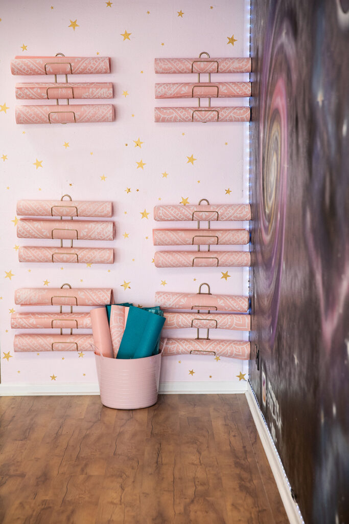 White string lights and fluffy pink and blue pillows line a wall of mirrors. Rolled pink yoga mats sit atop mounted gold hooks. The dimly lit space feels homey with a feminine and mystic flair. The back wall is covered with a galaxy-themed mural featuring pink and purple planets and the profile of a woman’s face. It was painted by local tattoo artist Tat2Slim.