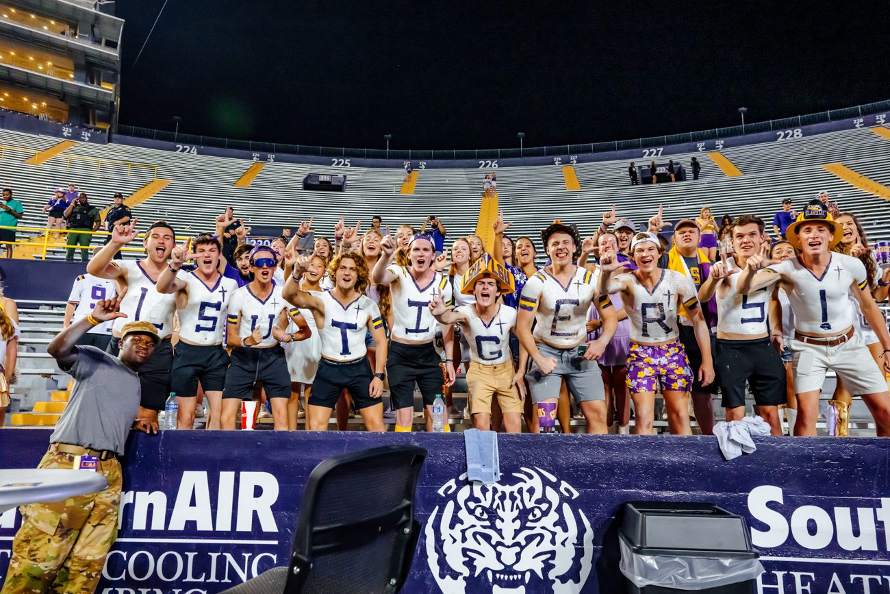 Since 2003, groups of die-hard student Tiger fans have made their presence known at almost every home game, with loud roars and chests slathered in purple and gold. Also known as the LSU Painted Posse, this unofficial student organization can always be seen taking up the best seats in the house: section 202, row 1 of Tiger Stadium.