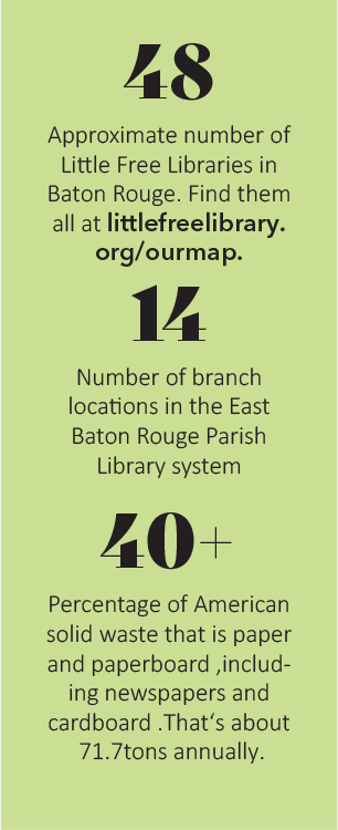 Another sustainable strategy is to borrow books from the growing number of Little Free Libraries that have popped up in some Baton Rouge neighborhoods, each holding titles for children and adults. Pick one up while you’re walking your dog, and return it at your leisure. You can also donate books to the library you think would be good additions to your fellow borrowers.