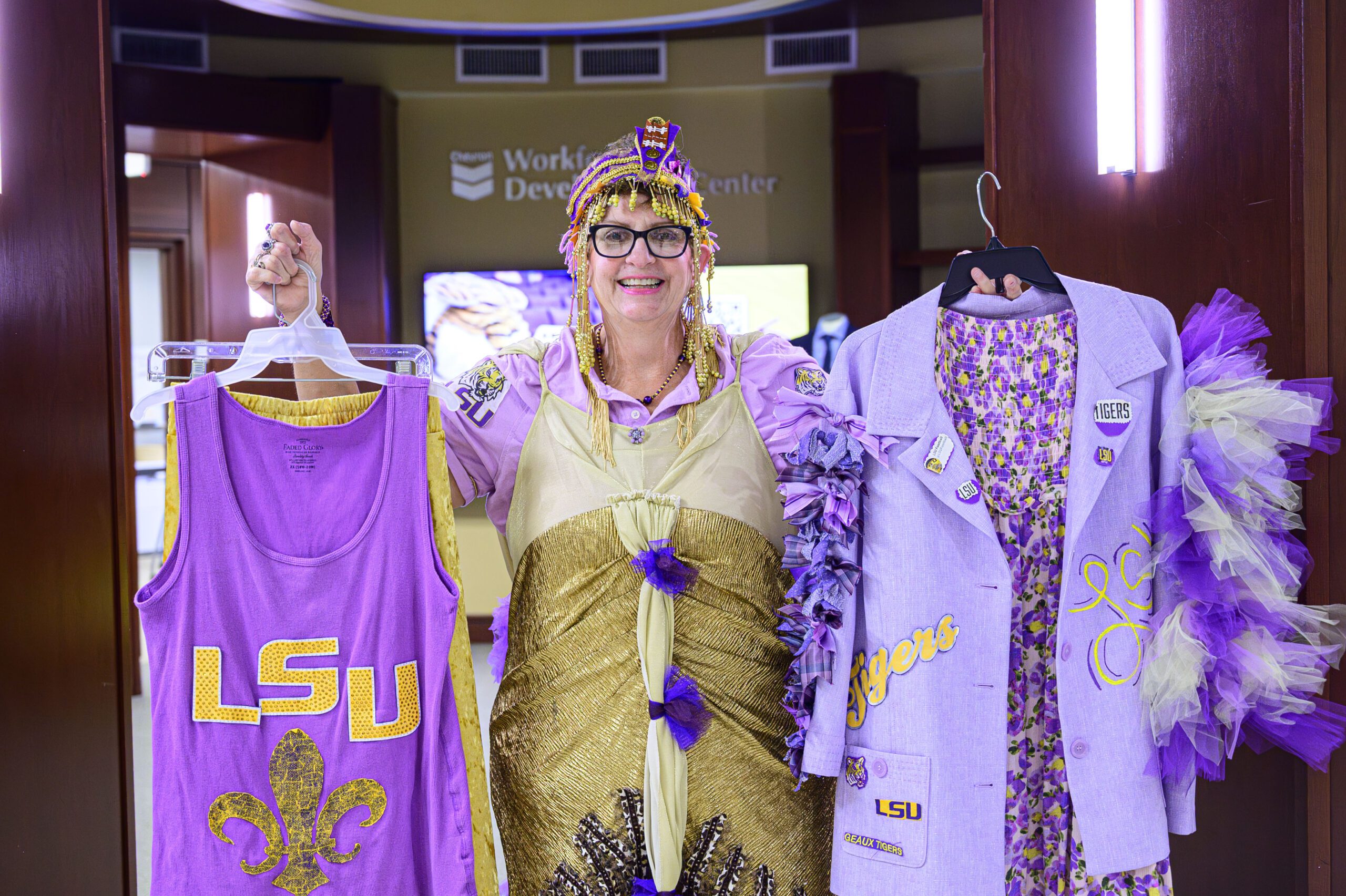 Sommers shows off some of her past outfits at the LSU Olinde Career Center, an entity for which she volunteers and raises funds.