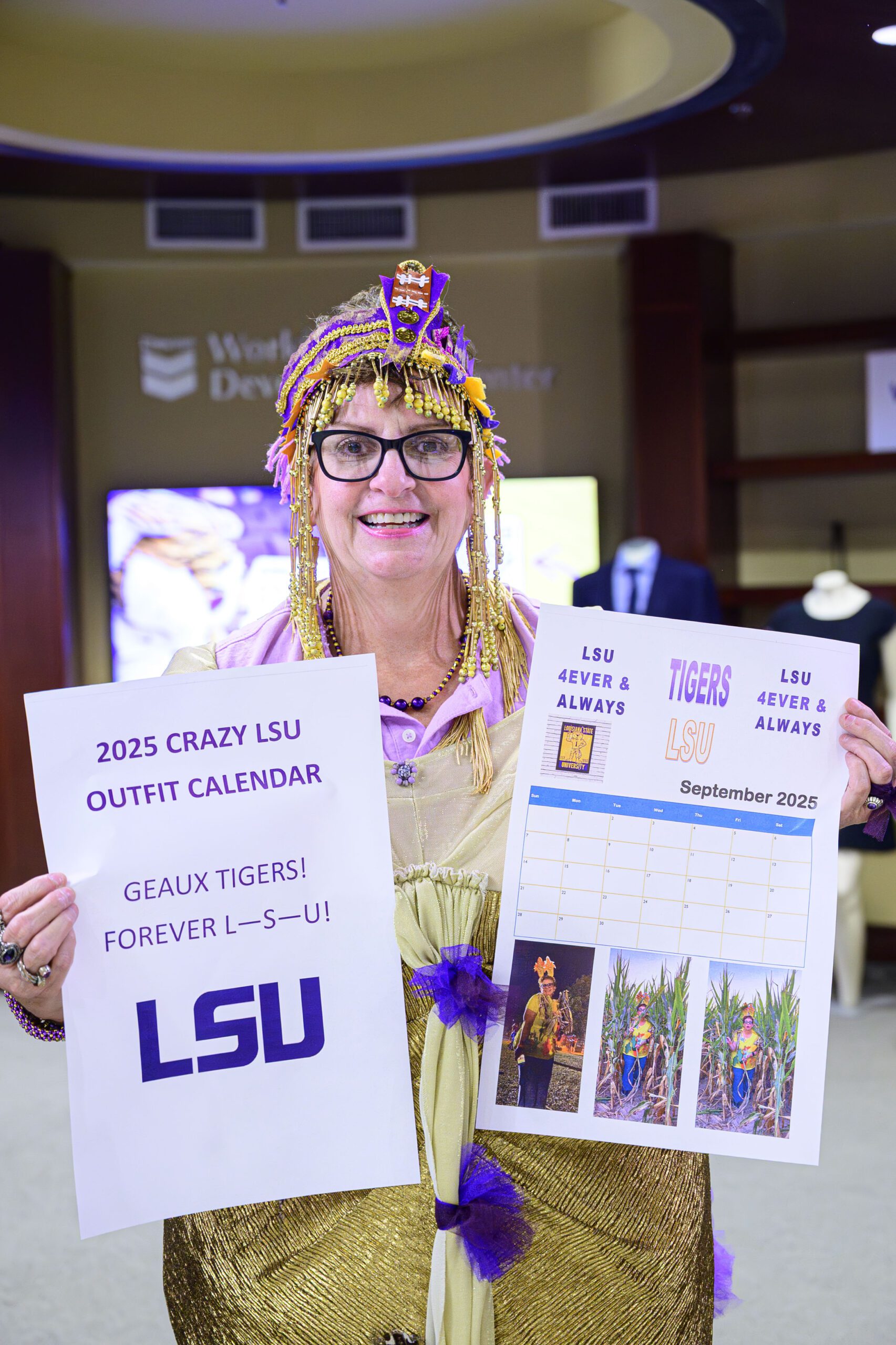 But there’s also a bigger-picture meaning to Sommers’ styles. Since LSU football plays 12 regular-season games, Sommers takes a picture of herself wearing 12 different eccentric costumes and creates a calendar that she sells. All the profits are put back into the school through the Waymakers Foundation, an organization she founded in 2022.