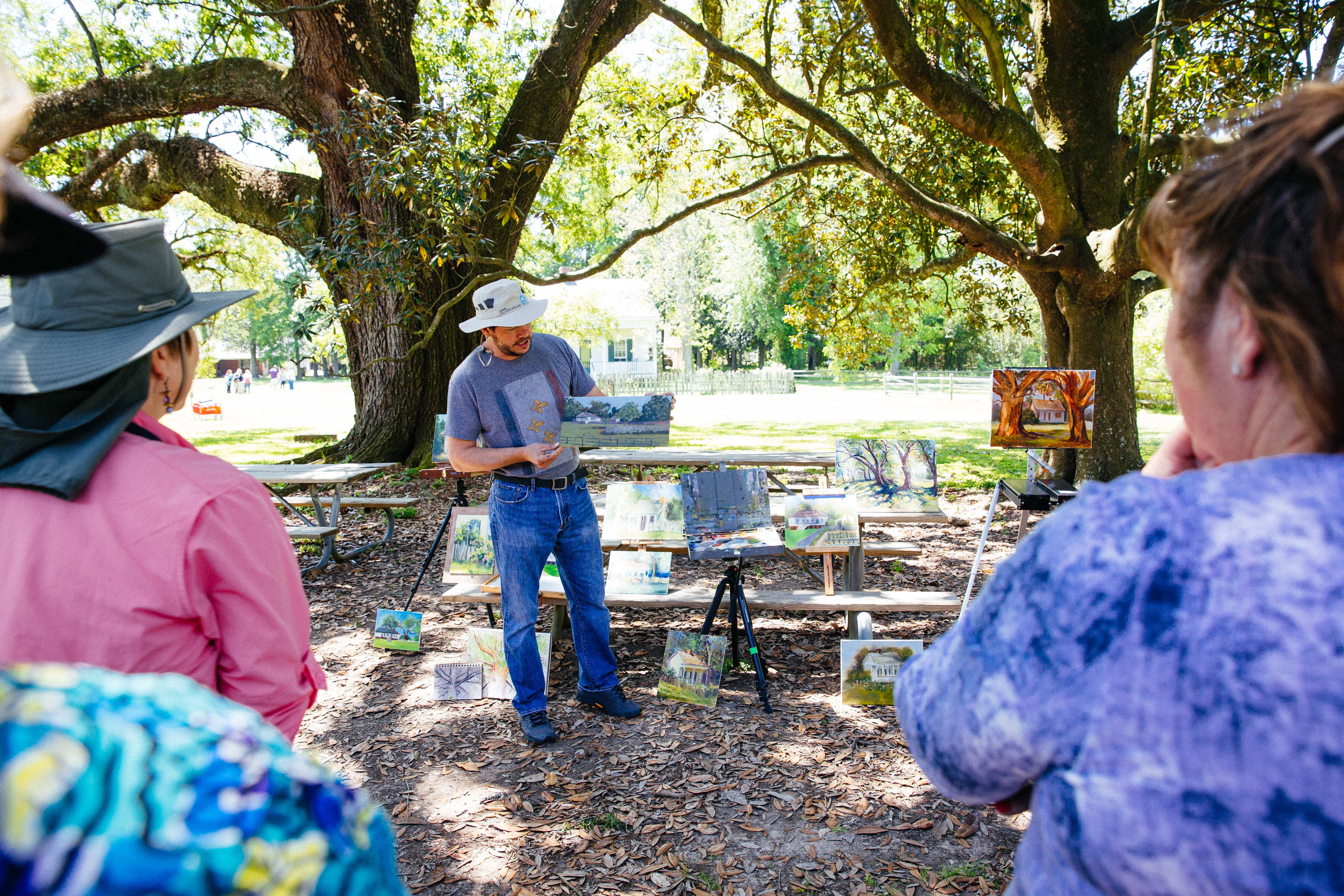Gary moves his easel as the dappled light moves across the plantation grounds, keeping his canvas in the shadows of the tree. Paint looks different in direct sunlight, he says.