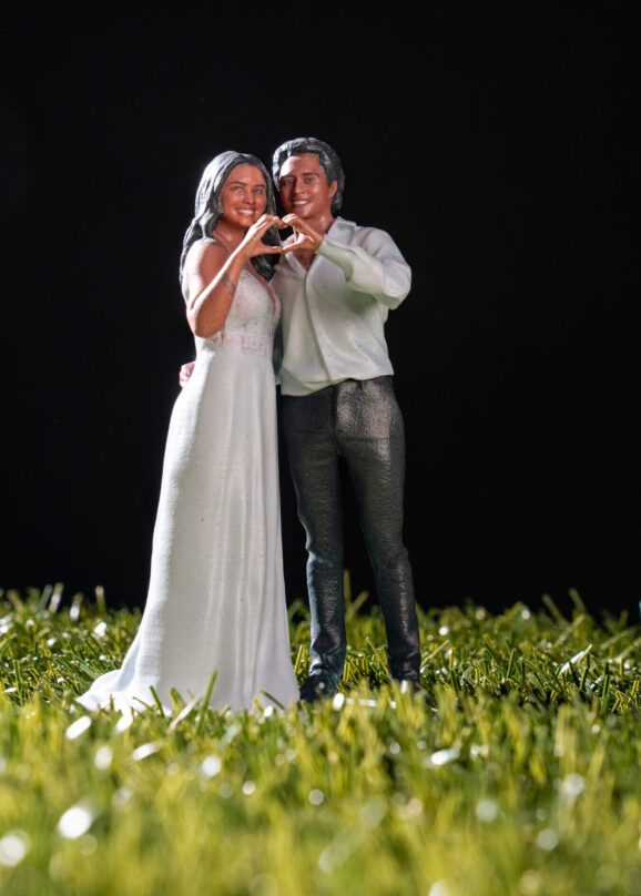 The figures will capture almost every detail, from the texture of jeans to the imprint of wallets in pockets, Anne says. But, there are a few things that are hard to 3D print. She says metallic fabric usually doesn’t show, and tiny embellishments like feathers may lack realism. Eyeglasses are also not recommended, because the glare can block the eyes. Customers shouldn’t pose with peace signs or hold up thin props due to potential breakage on the smaller figures.
