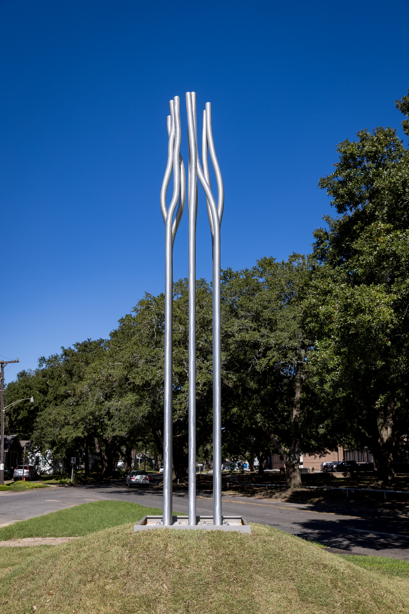 “The idea for this piece had to do with the four elements that are basic to human existence,” he says. “And it reflects the texture of the neighborhood. We also thought about how it would be situated in this particular site. The silver offers a contrast to the live oaks and other trees.”