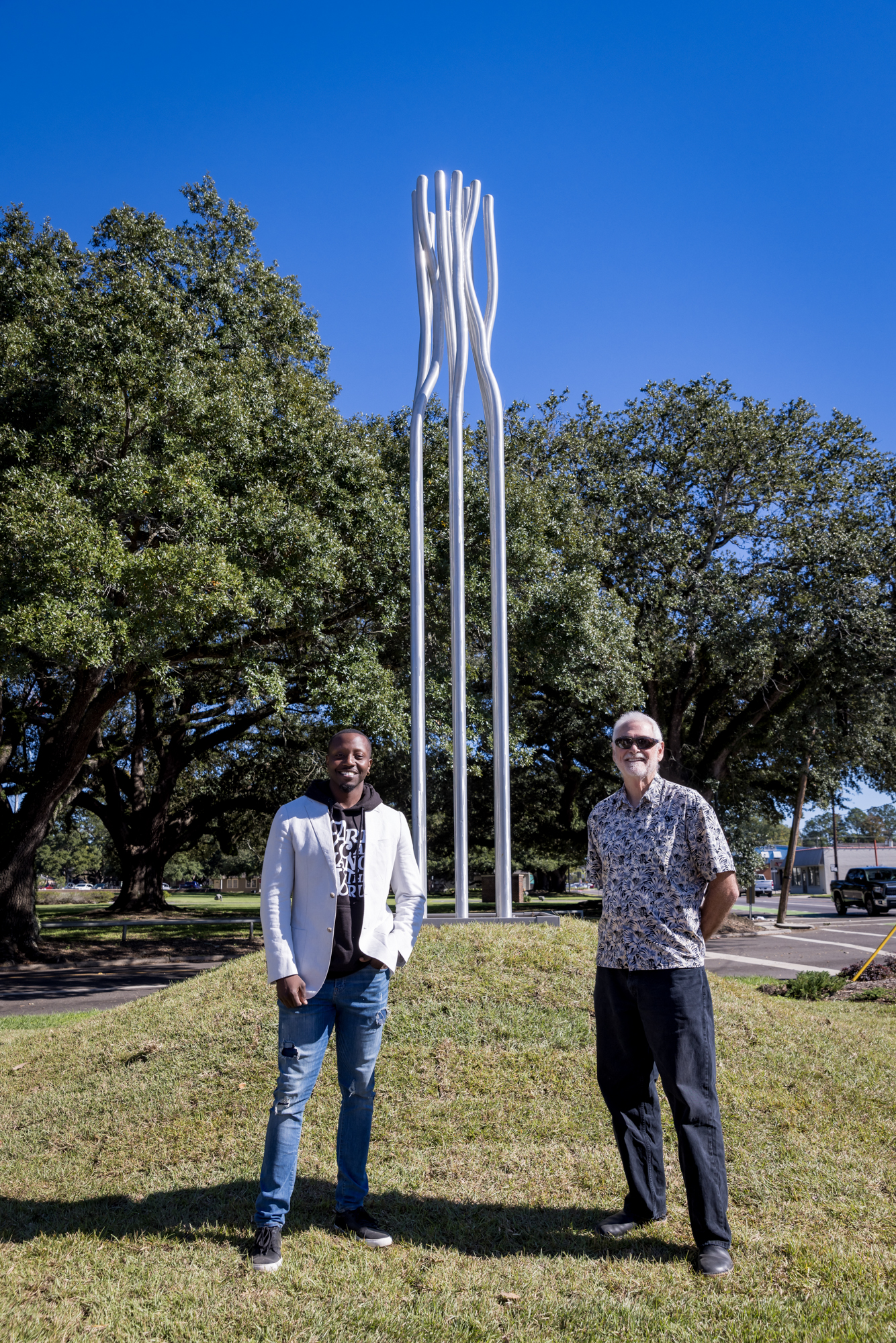 Allen says the pair worked on the piece over eight months. They brought the completed work from Shreveport to Baton Rouge on a flatbed truck a couple weeks ago for installation. It arrived as a large, single unit and was installed on the site with help from Arkel Constructors. JR Construction Solutions created the 3-foot foundation, and GroundWorks installed the sod, Lemoine says.