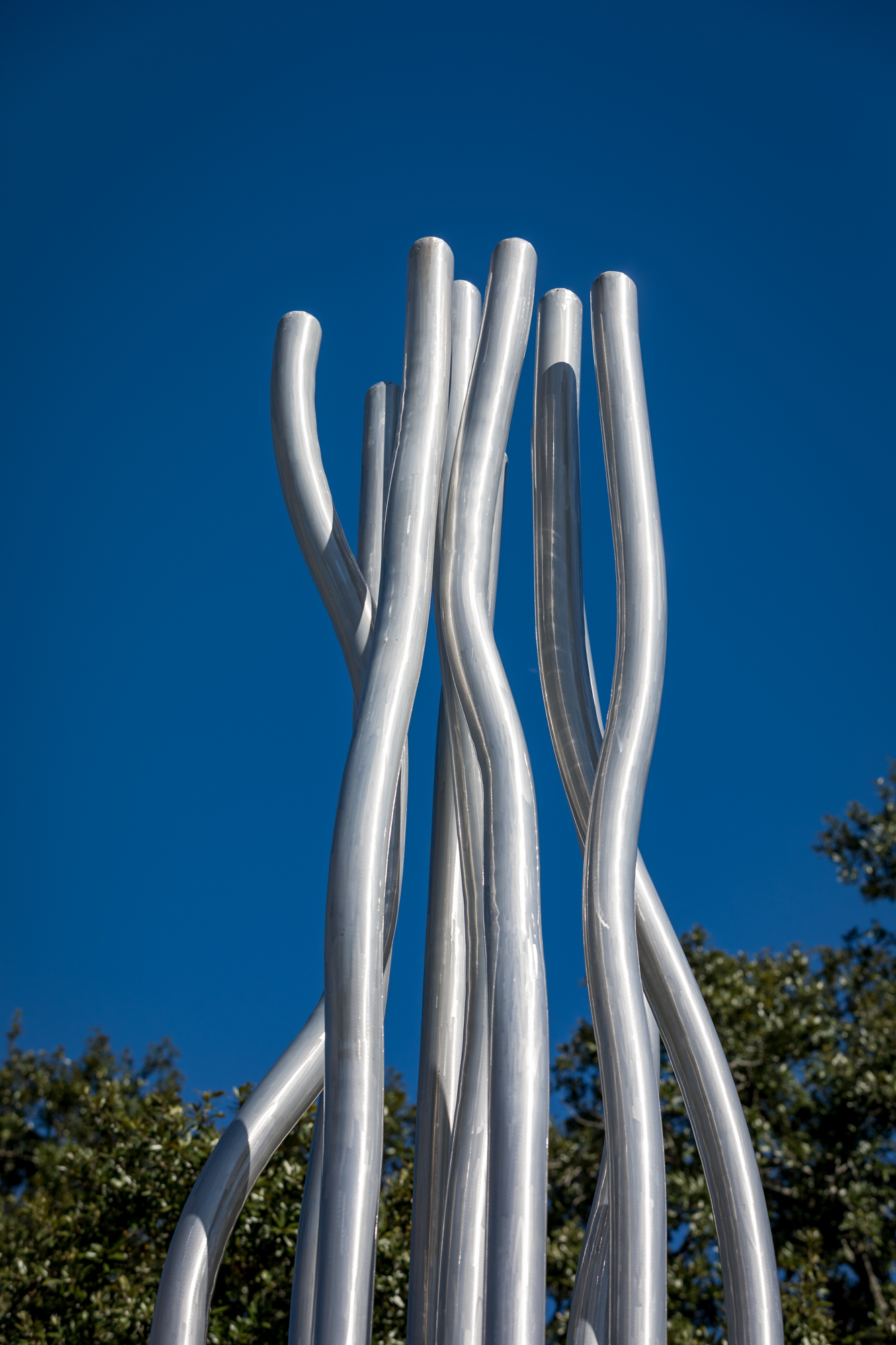 Water is evoked by the rippled etchings in the aluminum. Wind is depicted literally—the sculpture sways slightly at the top on windy days. And the rods’ curvatures at the top could be waves or flickering flames.